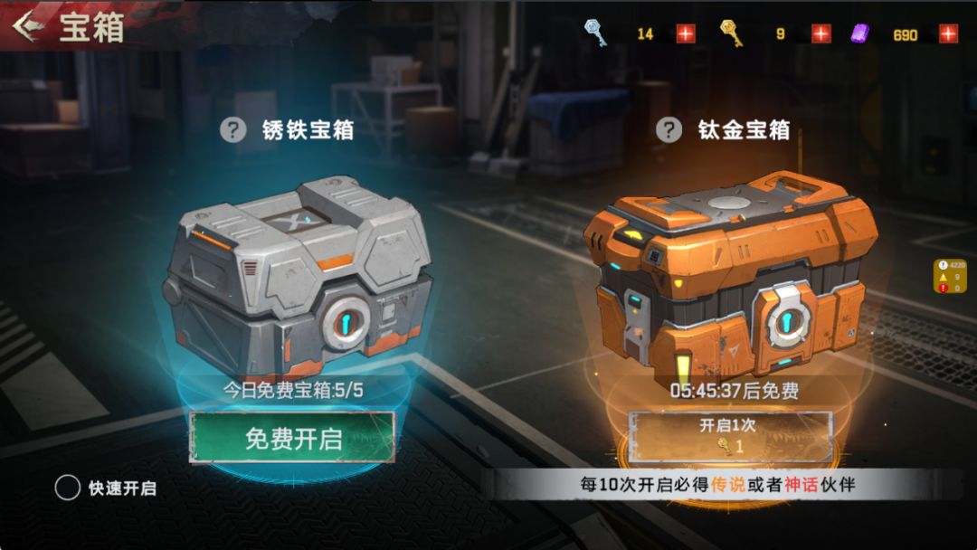 在基地的【伙伴中心】,开启宝箱获得新的异兽伙伴。锈铁宝箱每日可免费开启5次,钛金宝箱每日可免费开启2次。