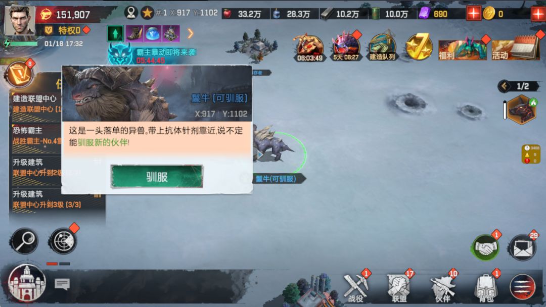 盟会同样也是本游的最重要的核心玩法,在掌握以上四种基础玩法后能更好地进阶盟会玩法。对争夺点的战略占领,基地版图的扩张和野外巨兽的集结攻打都需要用盟会的团队力量共同作战,海量的资源、更高阶的异兽和强力buff就存在于盟会的日常事务中。