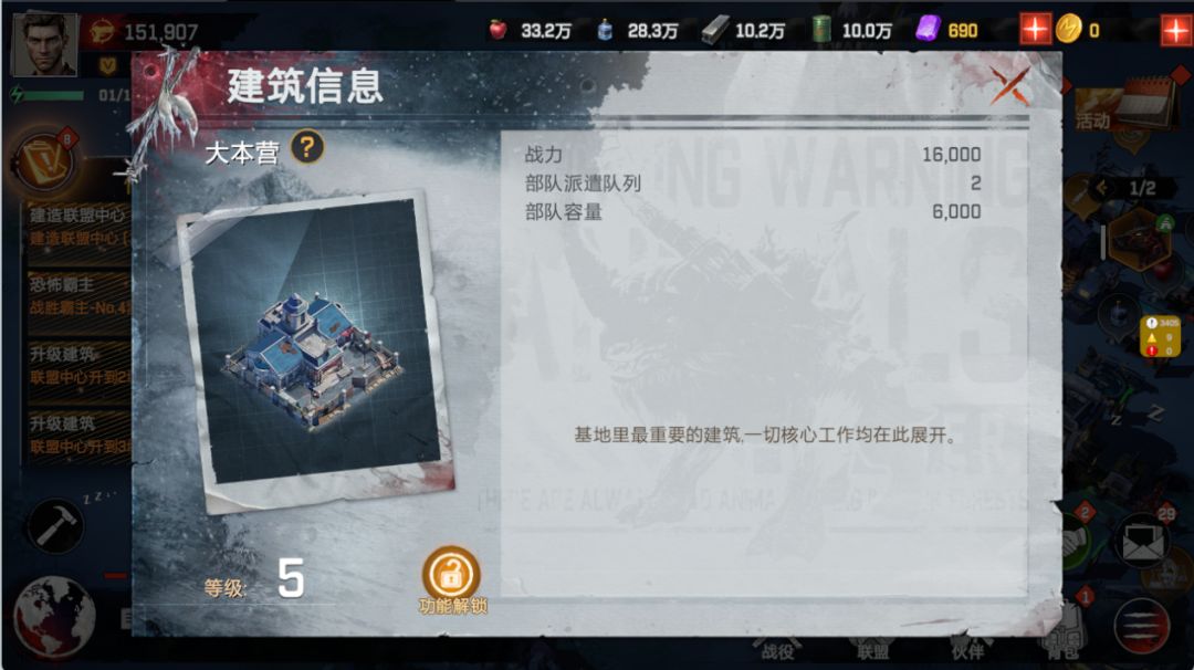在所有建筑中,大本营是最重要的建筑,可提升一切核心工作的发展,是进行其他建筑升级的基础,级数越高能解锁的功能和建筑就越多。在经营时需要着重关注。