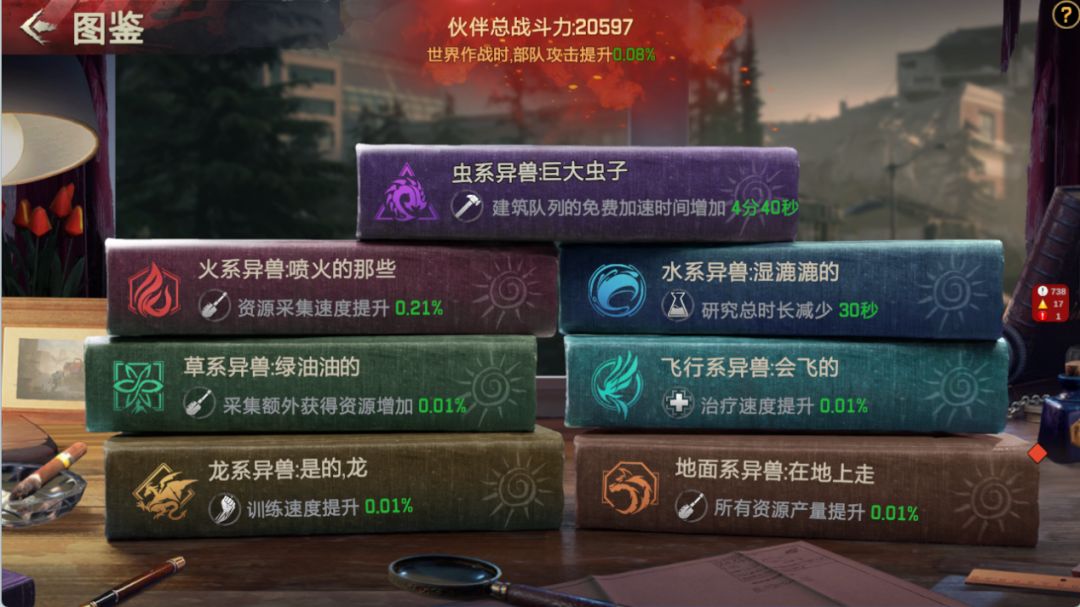 可以在图鉴里了解异兽伙伴的相关信息。每只异兽伙伴都有独立的研究课题,包括各种小目标,每完成一项小类目标就可获得对应的道具奖励。完成一种异兽的全部图鉴课题可以达成成就,在培养异兽之后记得去领取课题完成后的成就奖励哦~此外不同属性的异兽图鉴加成不同,可以根据自己的需求优先完成某一类属性的图鉴课题。