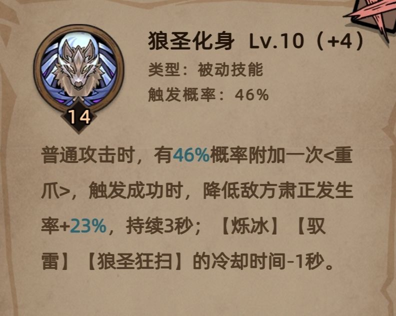 肃正:技能头17(留容错)+超越10+套装20+战斗狂欢30(不来洗技能了,1级+15级的数值比30高就对了)=17+10+20+30=77,狼圣化身被动还有20+,够用了