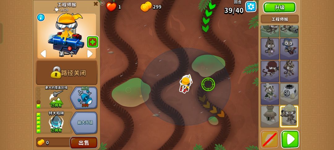 3 015工程师,需要操作。首先升级到014,把气球陷阱放到第三个道中上位置(如图4)。在气球陷阱满了,可以收的瞬间,收掉气球陷阱并把气球陷阱放到第三个道中下比较远的位置,能接上收到气球即可(如图5)。建议放的这两个位置离远点,方便操作。39波结束之后,升级到015,并把气球陷阱放到第四个道上(如图6)。(解法灵感来自评论区机帝神)