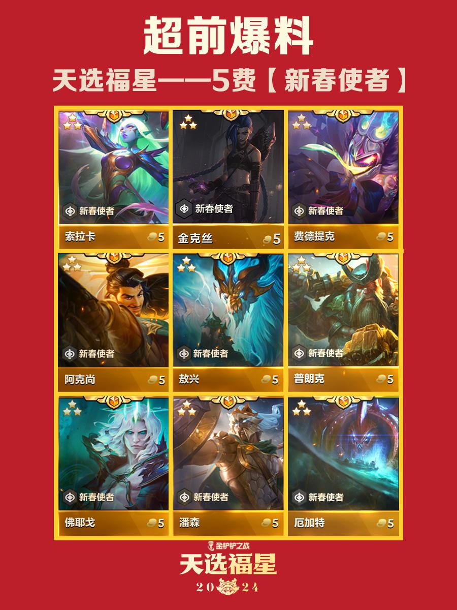 此外,本次赛季合计加入13位均为五费卡的“新春使者”,他们分别是:索拉卡、金克丝、费德提克、阿克尚、敖兴、普朗克、佛耶戈、潘森、厄加特、娑娜、克格莫、婕拉、库奇。
