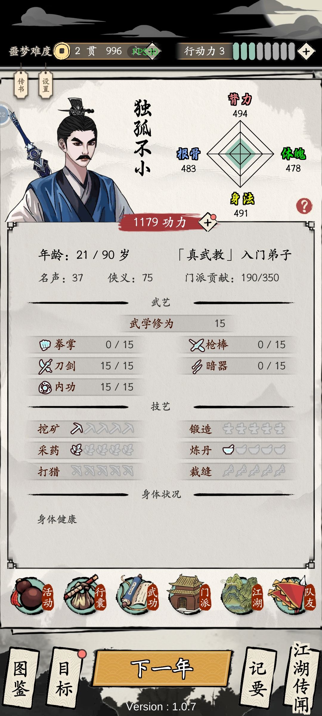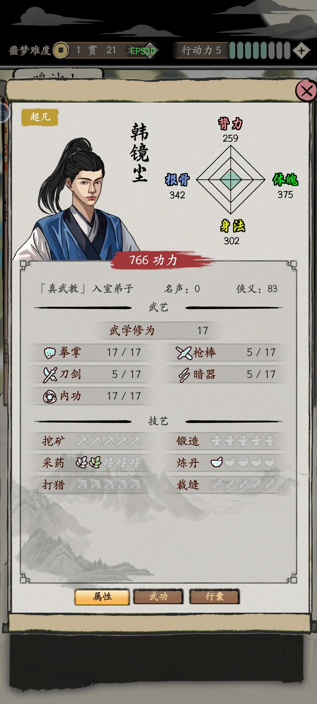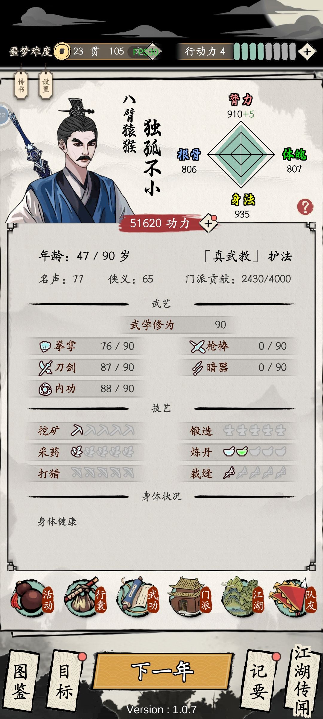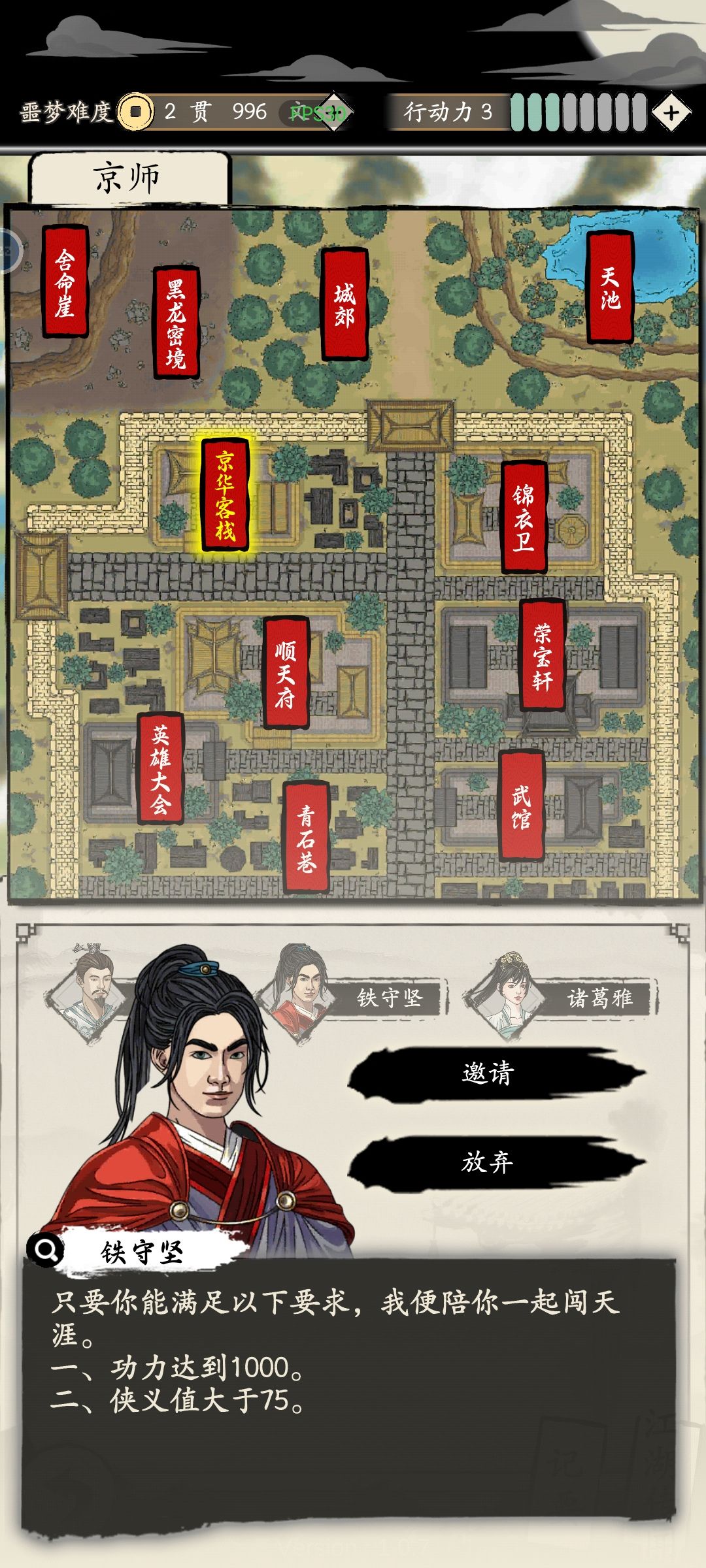然后我们在21岁时把侠义刷到75,去京师城郊邀请慎行,京师客栈邀请铁守坚,两个都是超凡资质队友。