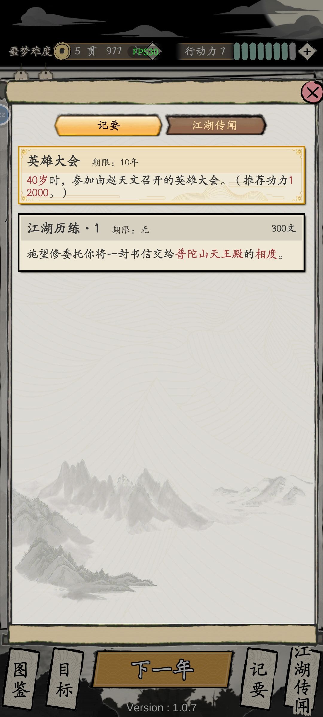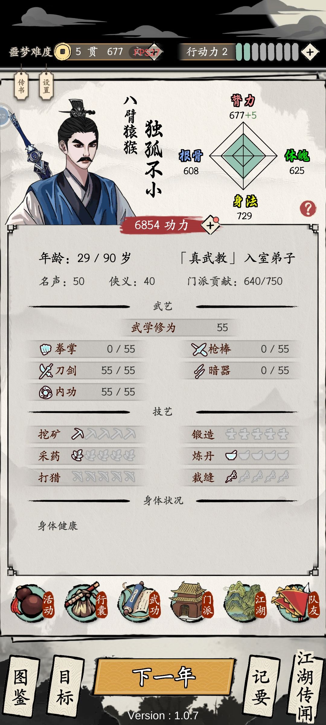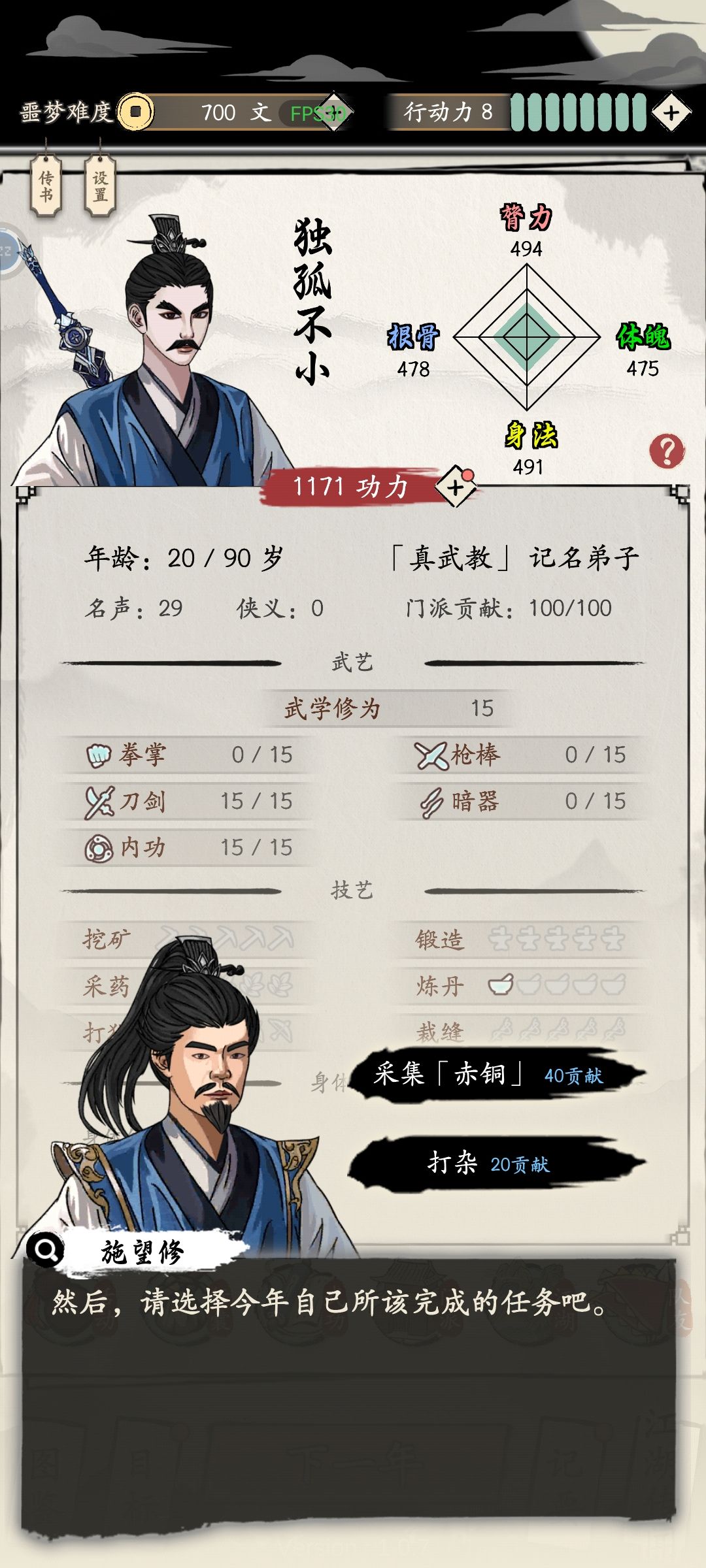 回归正题,20岁第一个任务出的是赤铜,有点倒霉。不过不用回档那么麻烦,正常玩顺其自然就好,只要偷学功法战力上去了,师门职位进度慢一点无所谓。