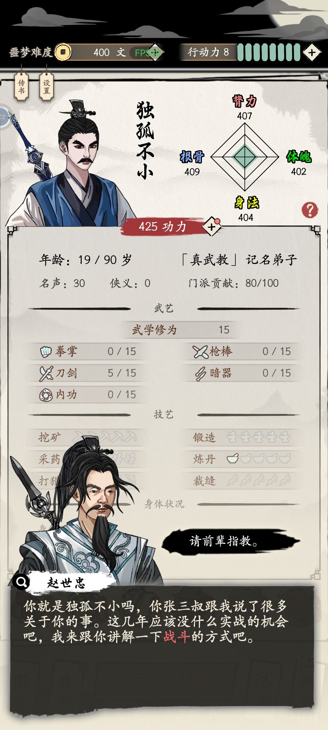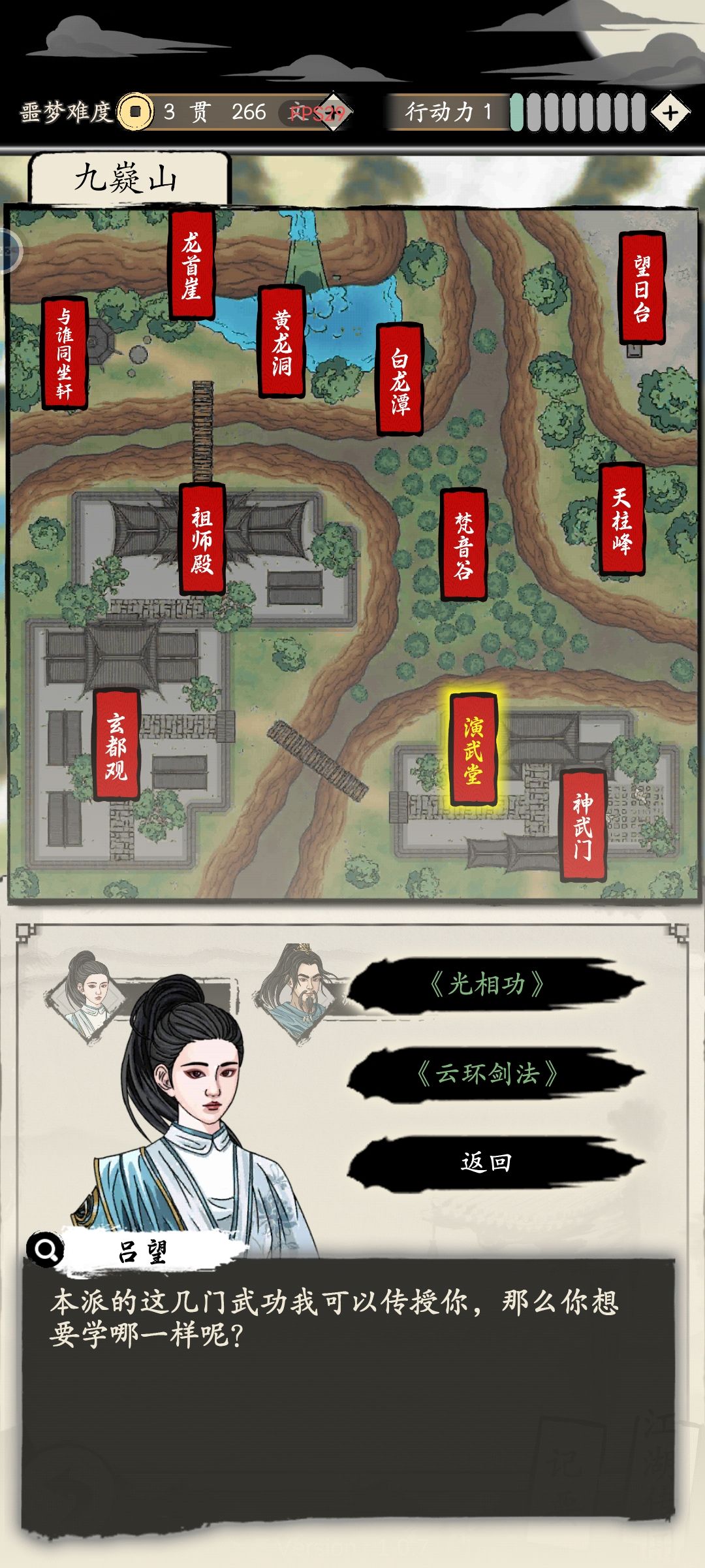 等职位升到护法,门派解锁你武学剩下部分,你学完后战力翻一倍飙到5w。