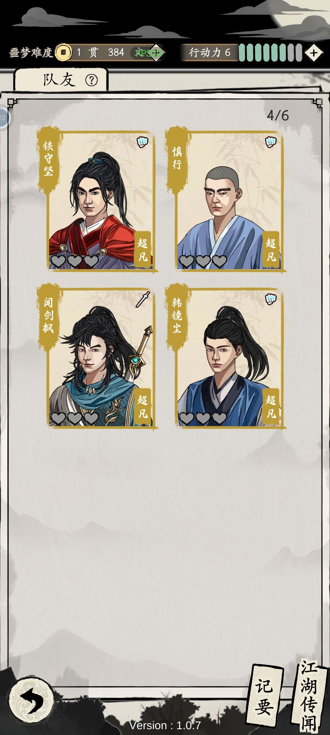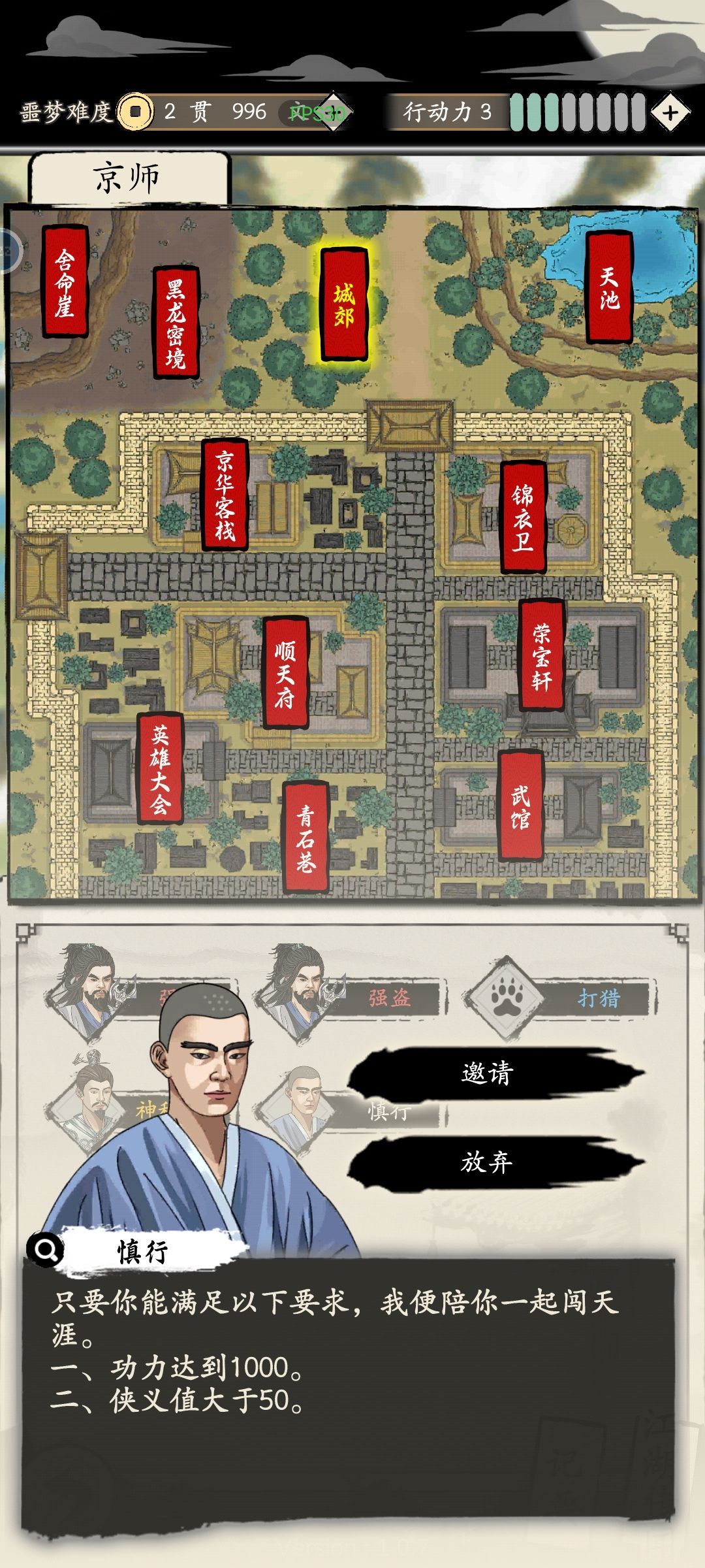 邀请队友:我们需要做锦衣卫任务刷到75以上侠义值,邀请一些资质强的队友。