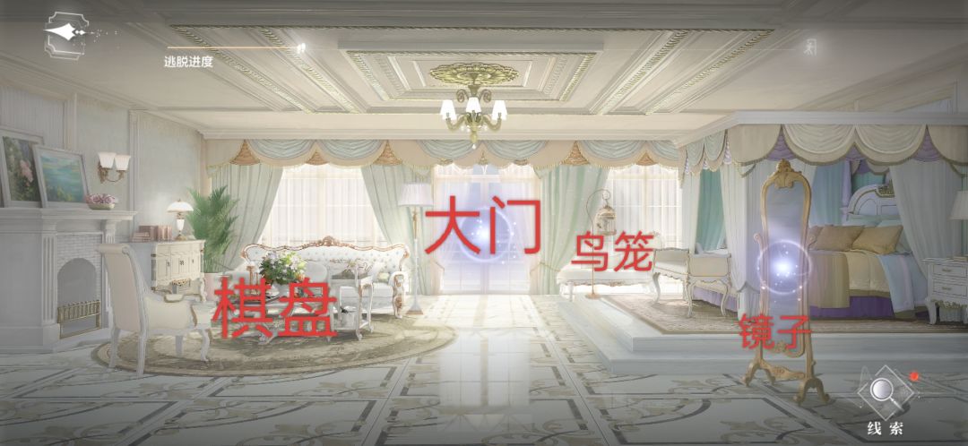 第一个房间——正常收集所有线索后离开房间  注:棋盘摆放如图