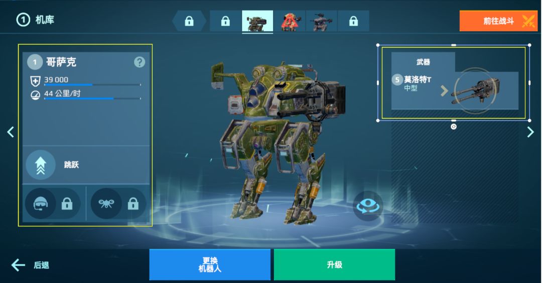占据主界面C位的是现有并出战状态下的机甲,指挥官可以点击机甲进入机库,进行更换、升级以及替换装备等操作。