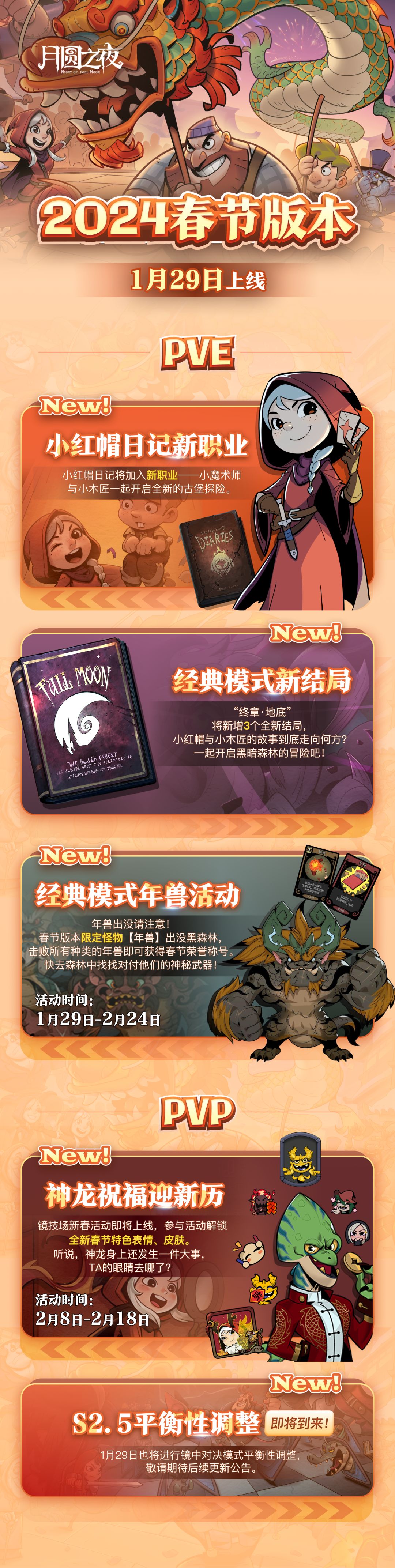 距离一年一度的春节只剩一个月啦~《月圆之夜》也将推出全新的版本和大家一起欢度佳节,PVE和PVP模式都将迎来重大更新哦~2024春节版本将于