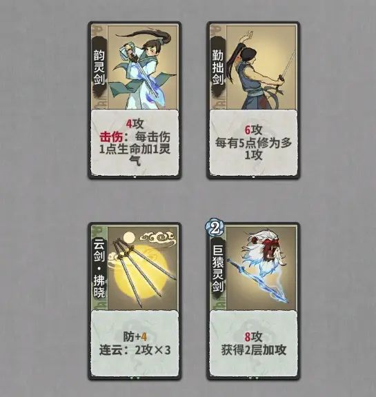 韵灵剑:看情况。单卡4伤4灵,前提是需要击伤,如果是先手角色,那么一动韵灵必定不会被挡,后面接耗蓝牌即可。如果是后手角色,就要观察对手的防御牌,尽量保证韵灵剑能击伤,也可以使用灵气灌注(练气,加灵,使下一次攻击无视防御)保证加灵。由于是击伤多少就加多少蓝,配合剑意可以将剑意的额外伤害也转化为灵气,在使用云舞飞灵万法速杀时,将飞灵换成韵灵伤害可能会更高。前提是对面没有防御去挡韵灵剑。总得来说就是一张前期过渡卡,由于需要击伤让这张卡限制很大。但是有整活的潜力。