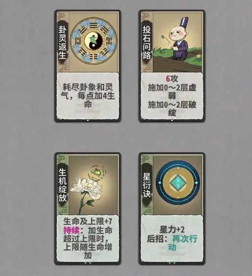 投石问路:稍强。练气万邪,练气耗俩卦对标耗俩蓝的化神强卡,大部分情况是给1卦,用来给对面上俩层虚弱。卦充裕也能给2卦,开出破绽。也可以不给卦,随机给个虚弱也不亏。需要注意上1层破绽时,在对方回合结束时会减一层破绽,等于没有,无卦的期望主要是虚弱,而不是破绽。后期不好用,过渡用用就行,需要吃卦限制还是太大了。
