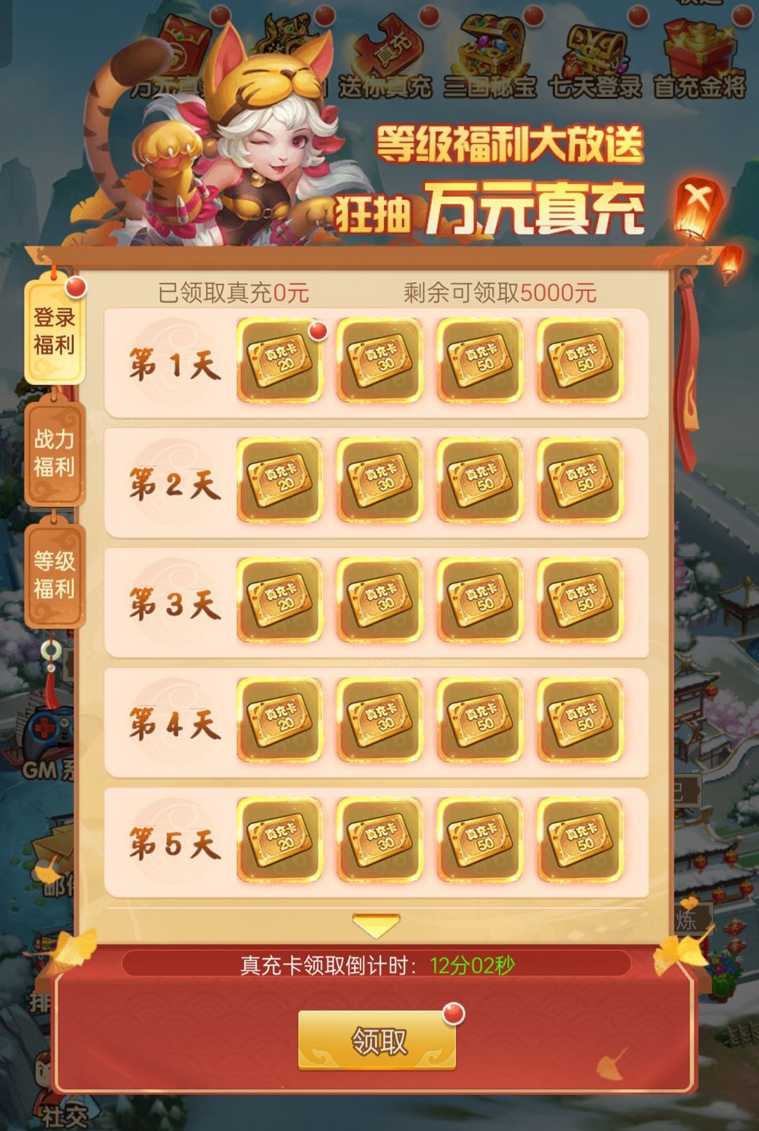 游戏中官方特别为各位主公准备了万元真充卡相送!每日登录游戏,在线达到一定时间即可免费领取,战力达到一定要求还可抽大额真充卡和元宝奖励!使用真充卡可以获得对应的元宝和VIP积分奖励,还可以参与对应的游戏活动获得超丰厚奖励!