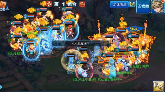 开局【晚睡队】双时客先手进攻配合剑客,成功只清掉对方两只宠物;但【梦之队】三输出的攻击更胜一筹,打飞对方4只宠物并且打出多人复活;