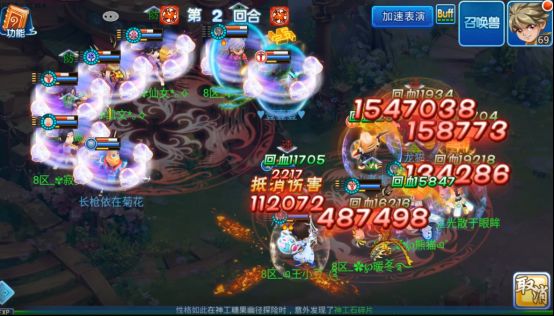 第2回合,【梦之队】开启青鸾圣兽技能加速后,刀客混元斩打出爆炸伤害加溅射效果将对方众人打倒;最终在第3回合清掉对方剩余的宠物拿下胜利;