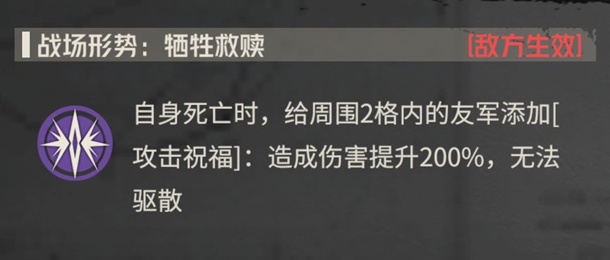 然后我们来看看这次战术模拟的buff战场形势,敌人死亡后会给周围两格的友军施加增伤buff,因为是67级,所以就算小怪吃到这个buff我方机体也是可以被直接融化的。