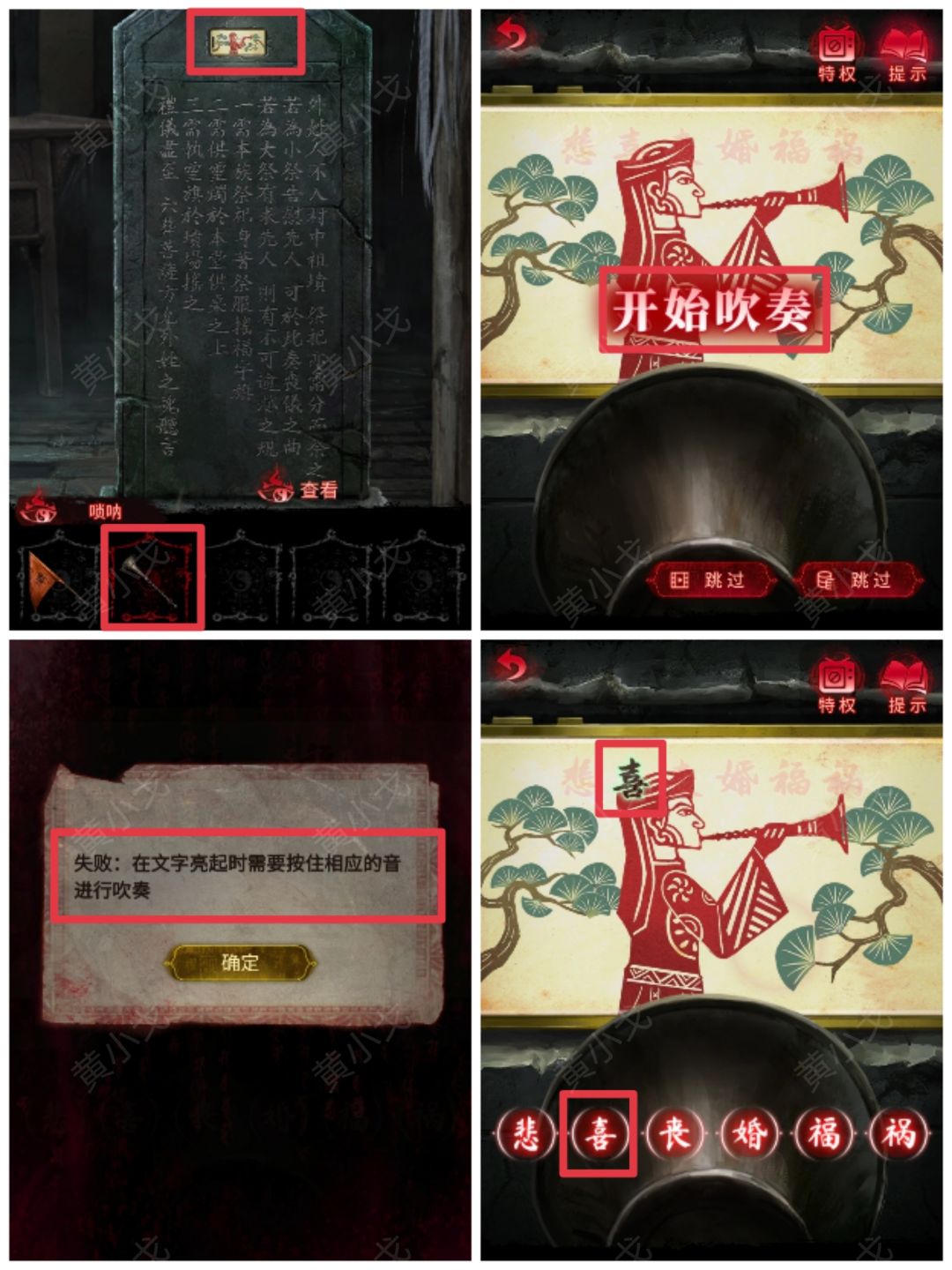 14.点击石碑,使用【唢呐】;点击手机屏幕,完成小游戏(在文字亮起时需要按住相应的音进行吹奏)