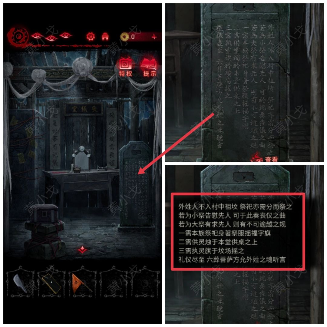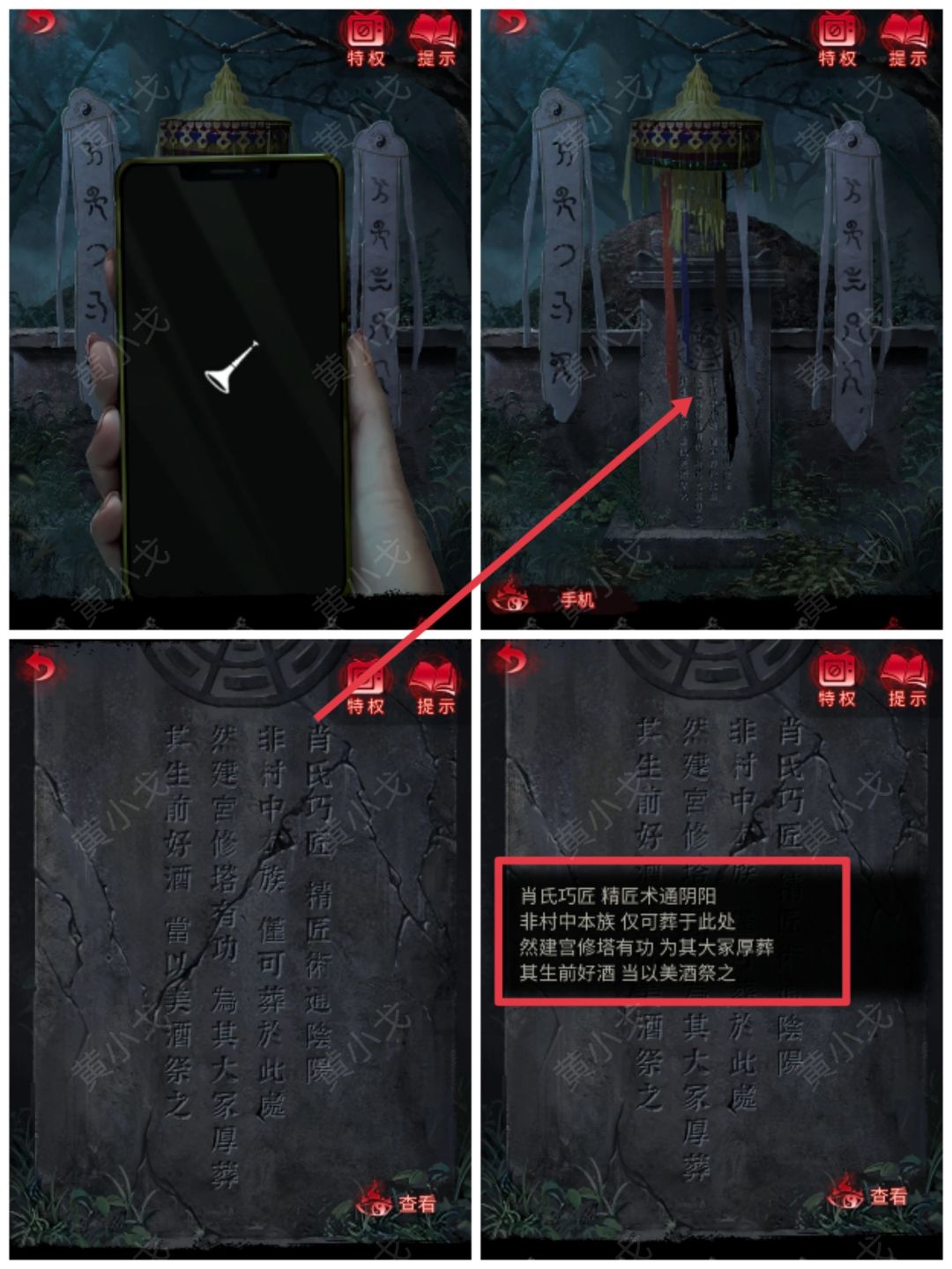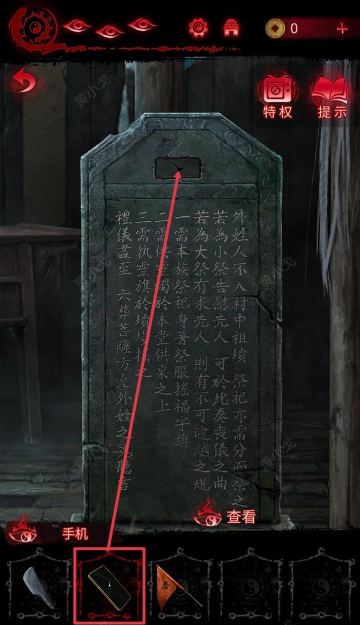 1.(坟场)点击无碑坟,使用【手机】,出现墓碑;点击查看墓碑内容