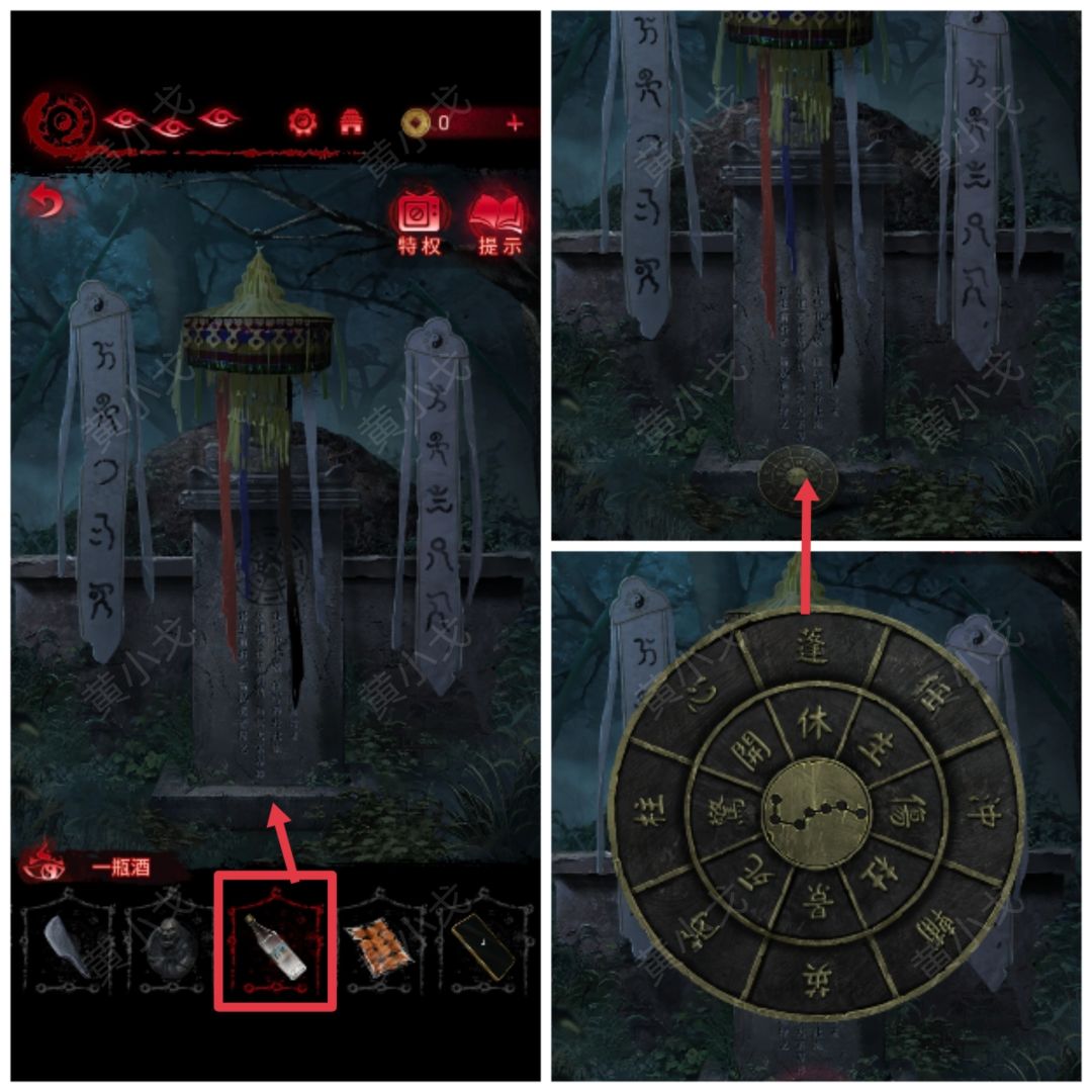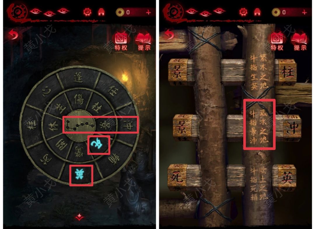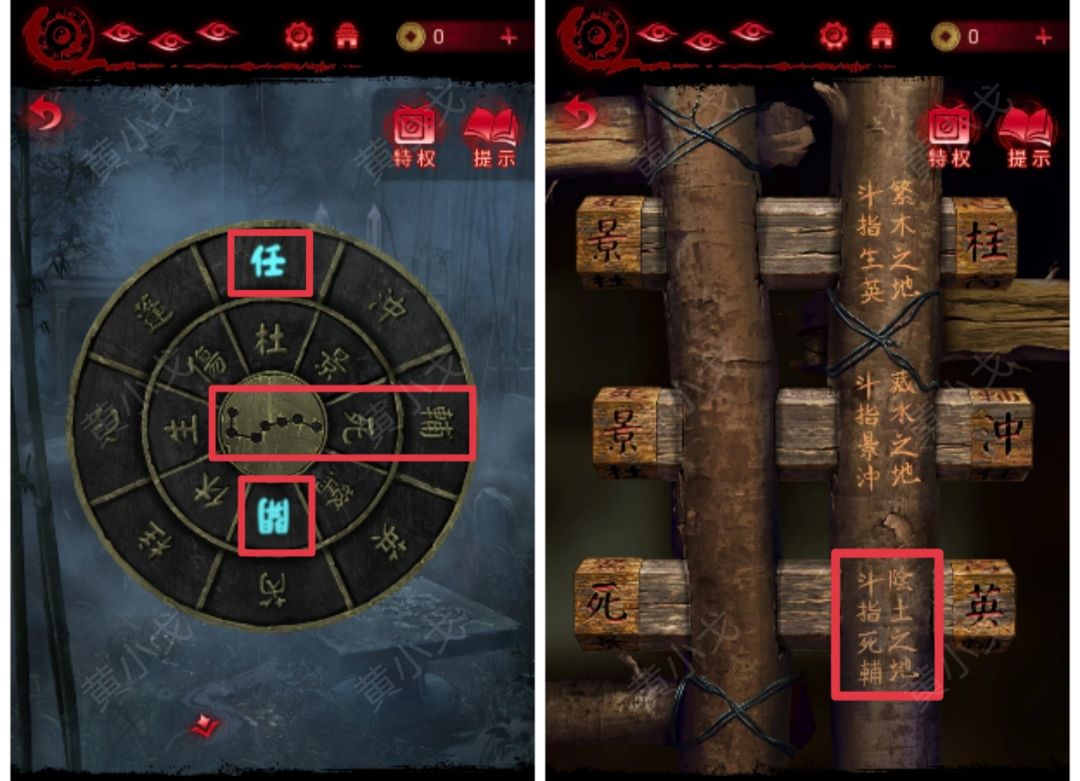 5.(山洞外)根据山洞门闩上的线索,将【壬盘】拨动至景、冲在最右侧(藏水之地,斗指景冲),获得线索