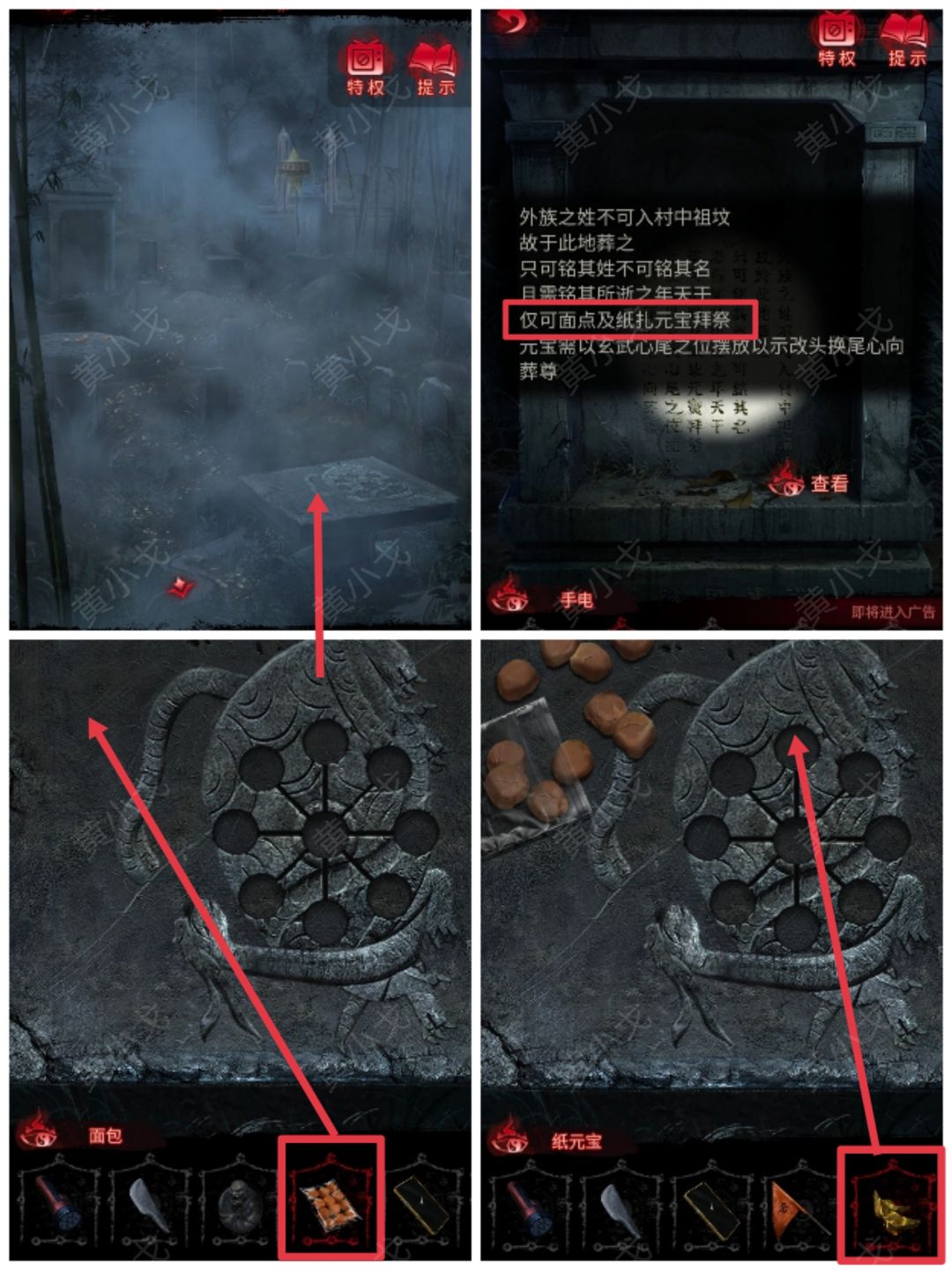 9.(坟场)点击方形石盘,根据石碑上的线索,放上【面包】和【纸元宝】祭拜