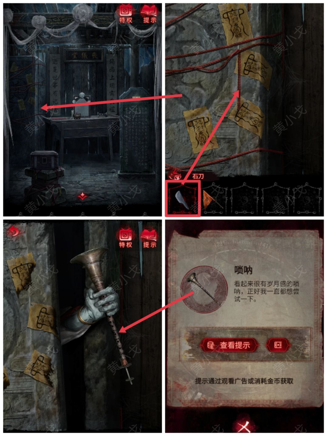 13.点击石棺,用【石刀】割断红绳,打开石棺,获得【唢呐】