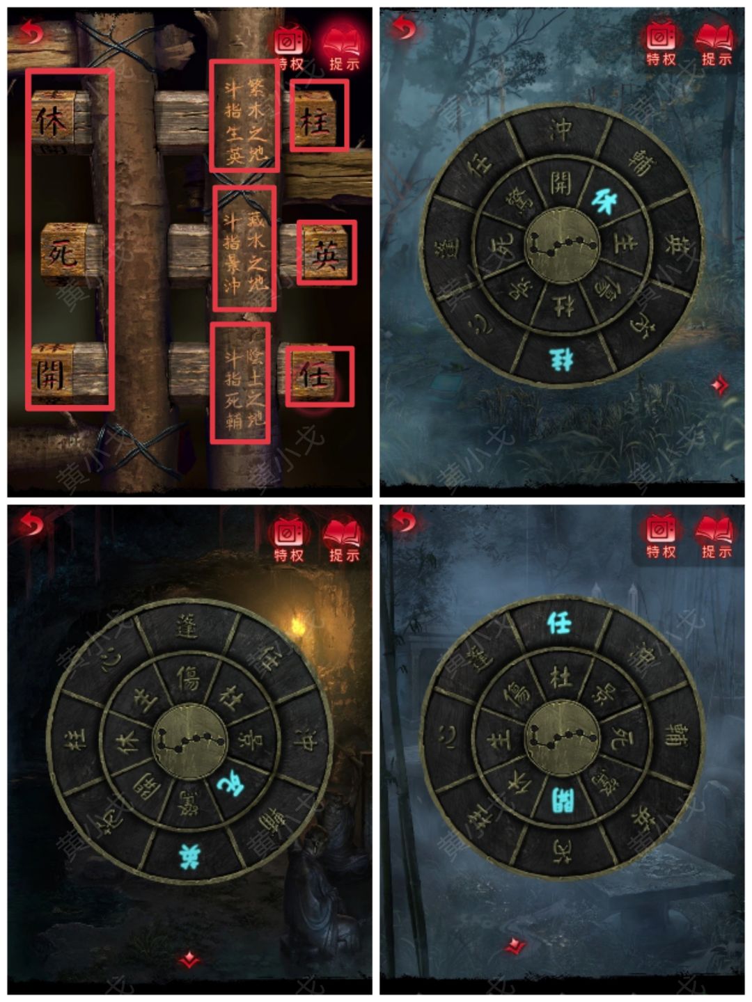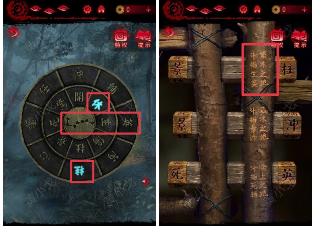 4.(树林)根据山洞门闩上的线索,将【壬盘】拨动至生、英在最右侧(繁木之地,斗指生英),获得线索
