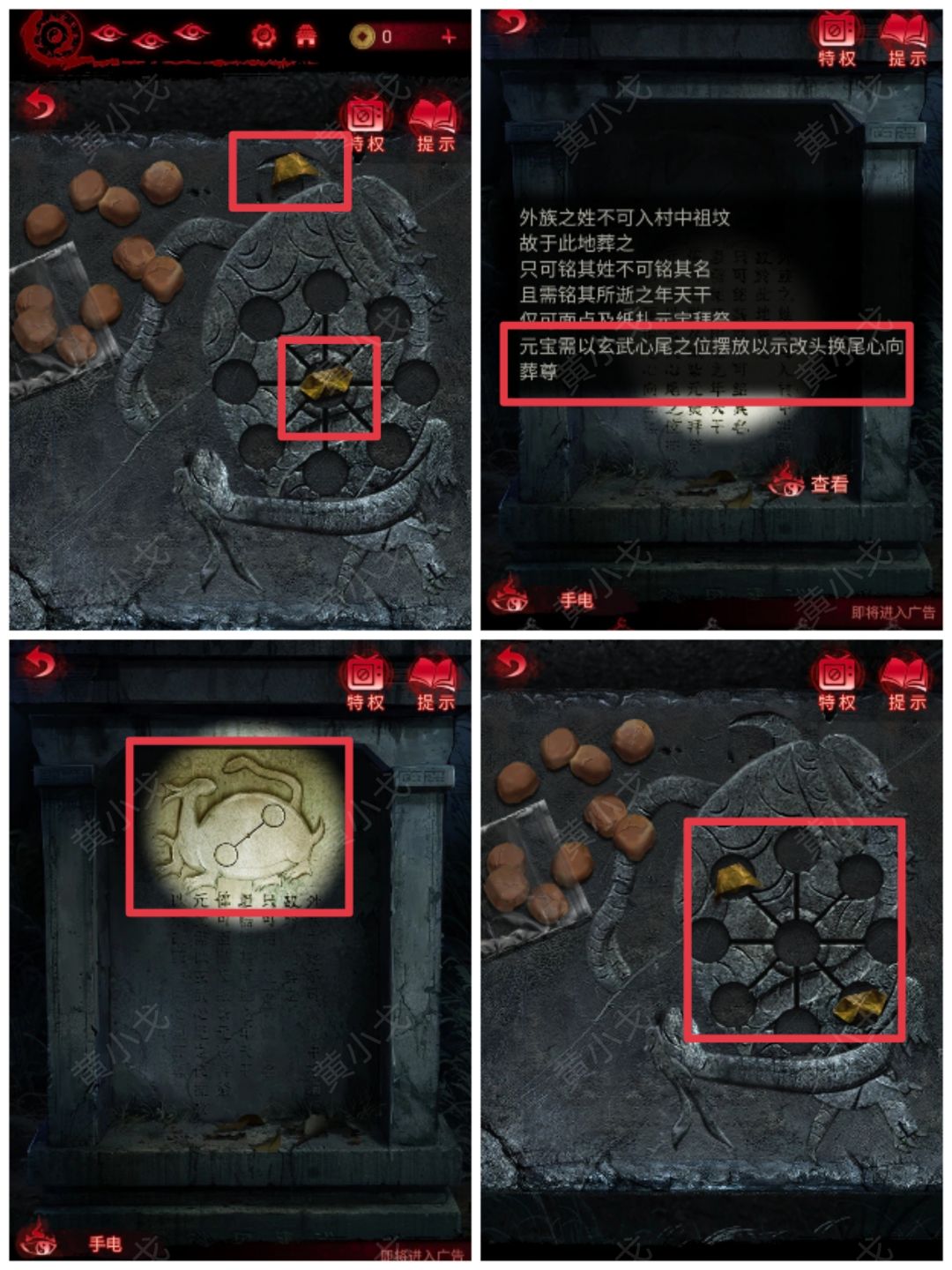 10.根据石碑上的字,摆放纸元宝的位置以改头换尾心向(元宝需以玄武心尾之位摆放);再根据石碑上的图案,放置纸元宝的位置