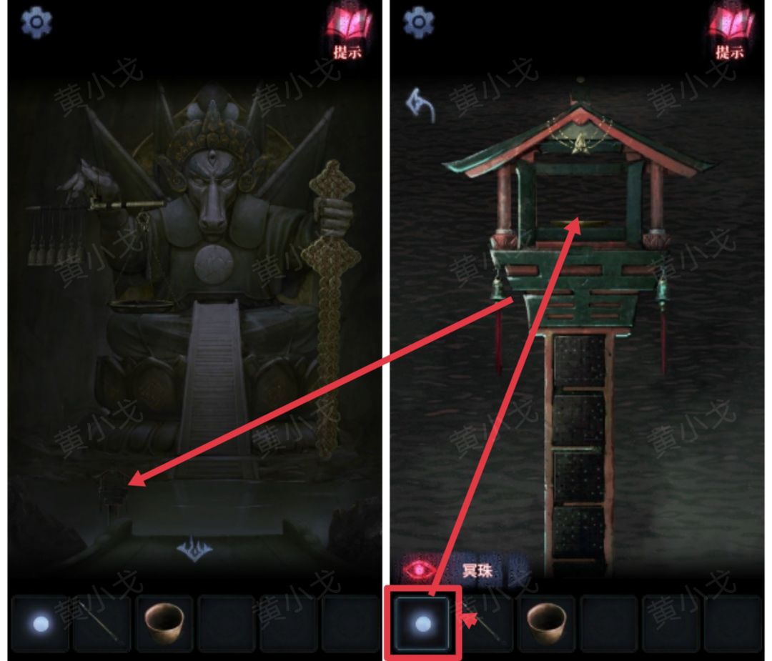 1.(马面石像)点击石灯,放入【冥珠】,河面出现石板路