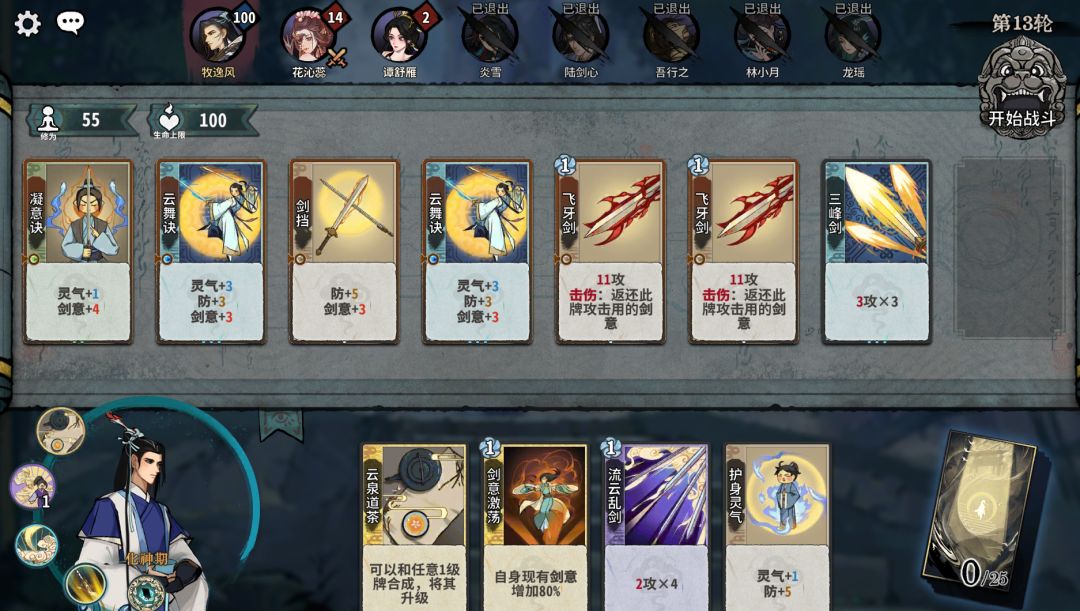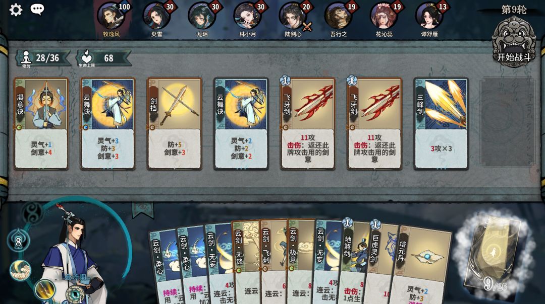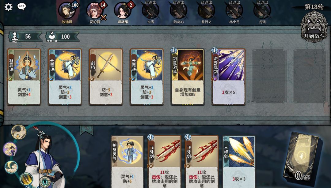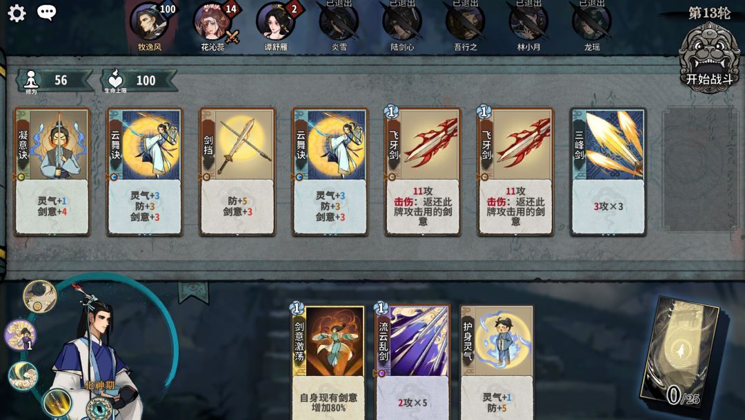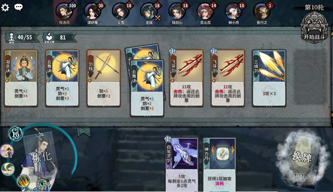 我们首先调整卡组格子中的卡牌,把卡组从最初的状态变成下面图片的状态,换下来的牌就直接放在手牌里面,然后直接点击右上方的开始战斗就可以了!这样调整的原因是剑意是一种强化卡牌攻击能力的属性,叠加剑意后使用攻击次数多的牌就能造成更高的伤害呢!
