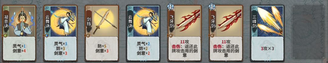 然后用2级流云乱剑替换三峰剑,用剑意激荡替换2张飞牙剑。