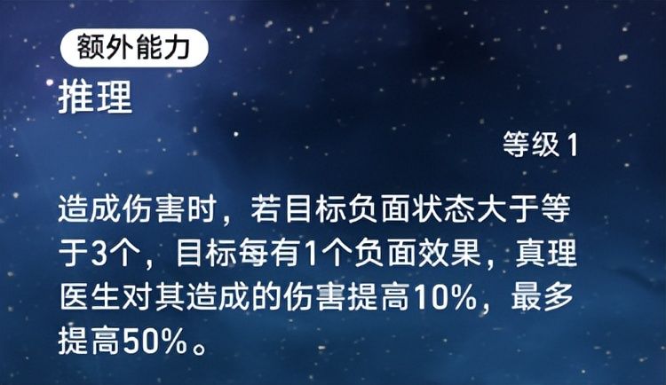负面效果:关键属性,真理医生的战技以及2个被动天赋都涉及到了负面效果带来的增益,其中3个负面状态是关键质点,最大为6层(归纳天赋),这边不推荐大家盲目堆负面,只要能到3个就非常好了,其他看实际情况。这边持续伤害,各种减益都属于负面效果,实际上要达到3个还是很容易的。