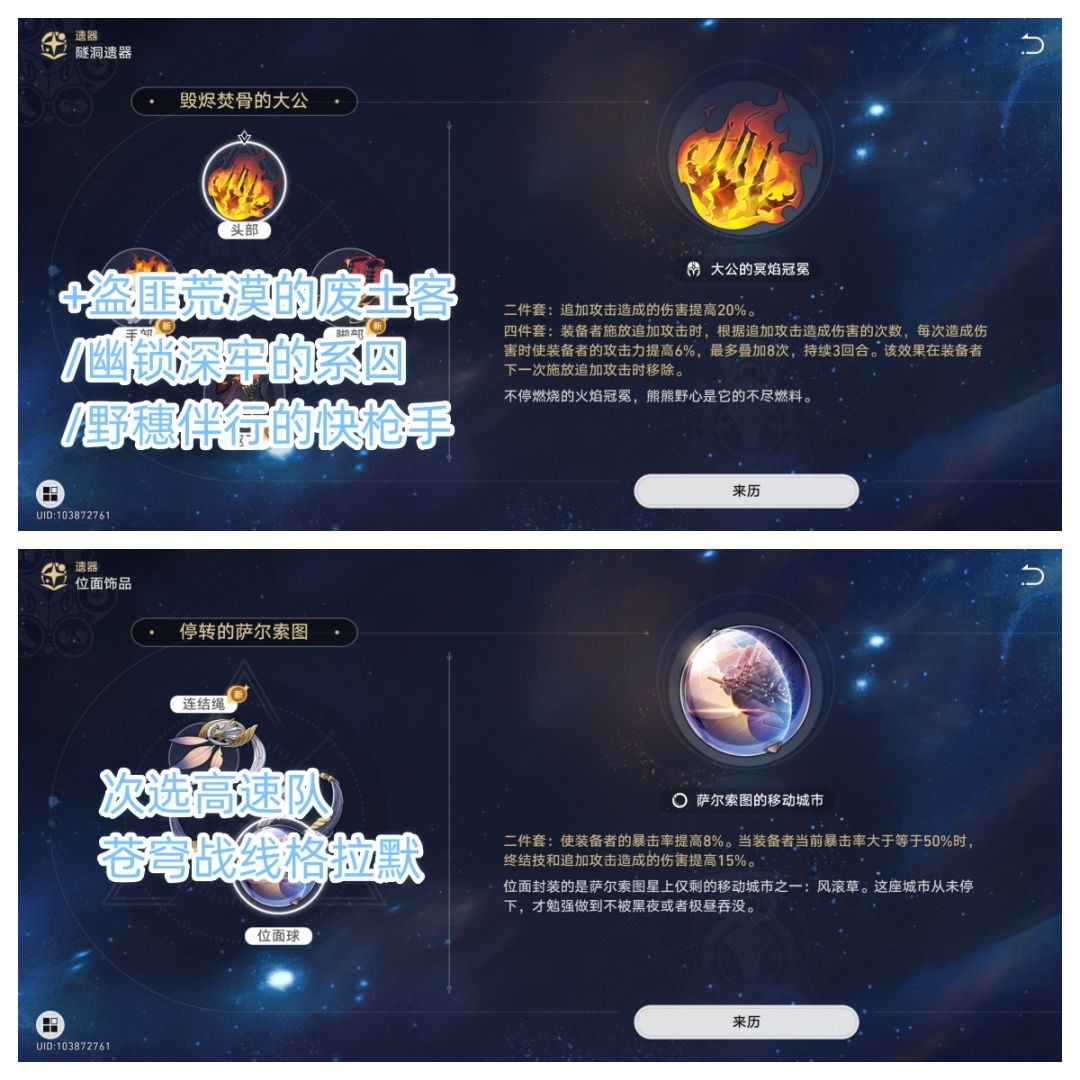 说明:可以看出专武是最优的,其次则是托帕专武,而接下来的2个4星光锥与环境有很大关系,求稳定的话就还是用模拟宇宙换的那个。