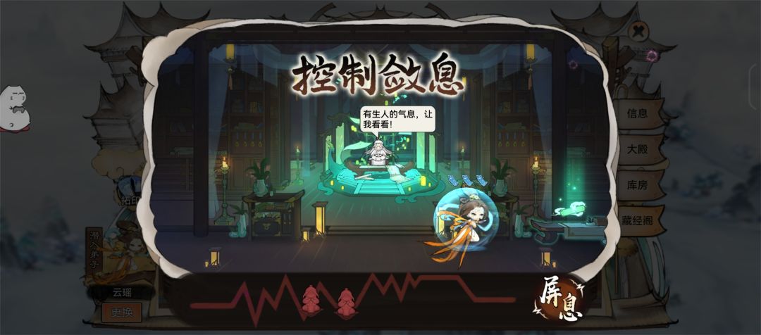 拓印小游戏开始后不要被长老的x光眼干扰,请注意下方的红线,每当红线走到盘坐的小人中间时我们需要点击右边的屏息按钮,这样红线走完后我们的弟子就可以前进了,长老会探查两到三次,当我们成功多过探查,抵达玉简面前就算成功