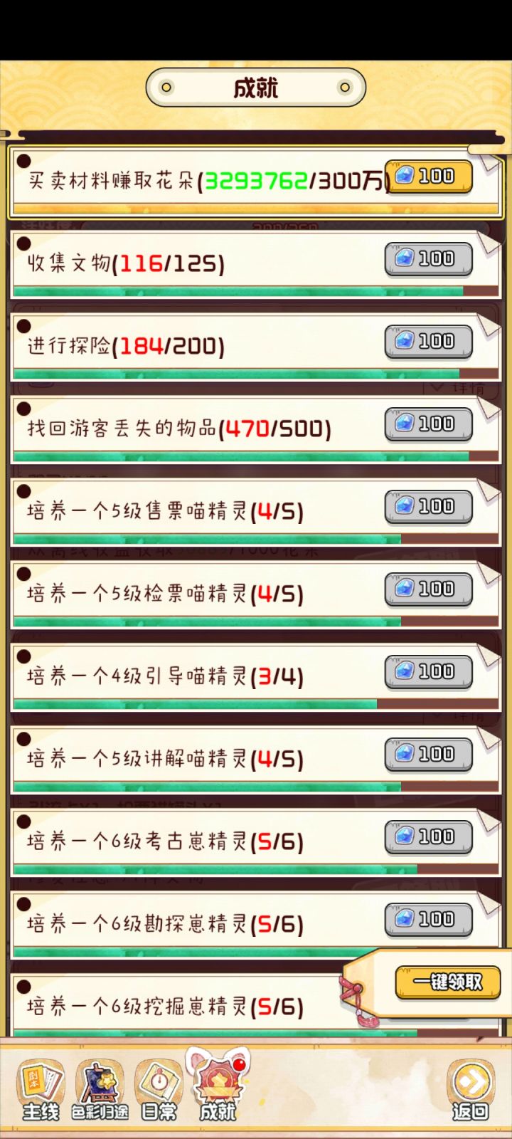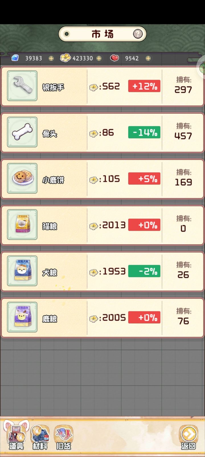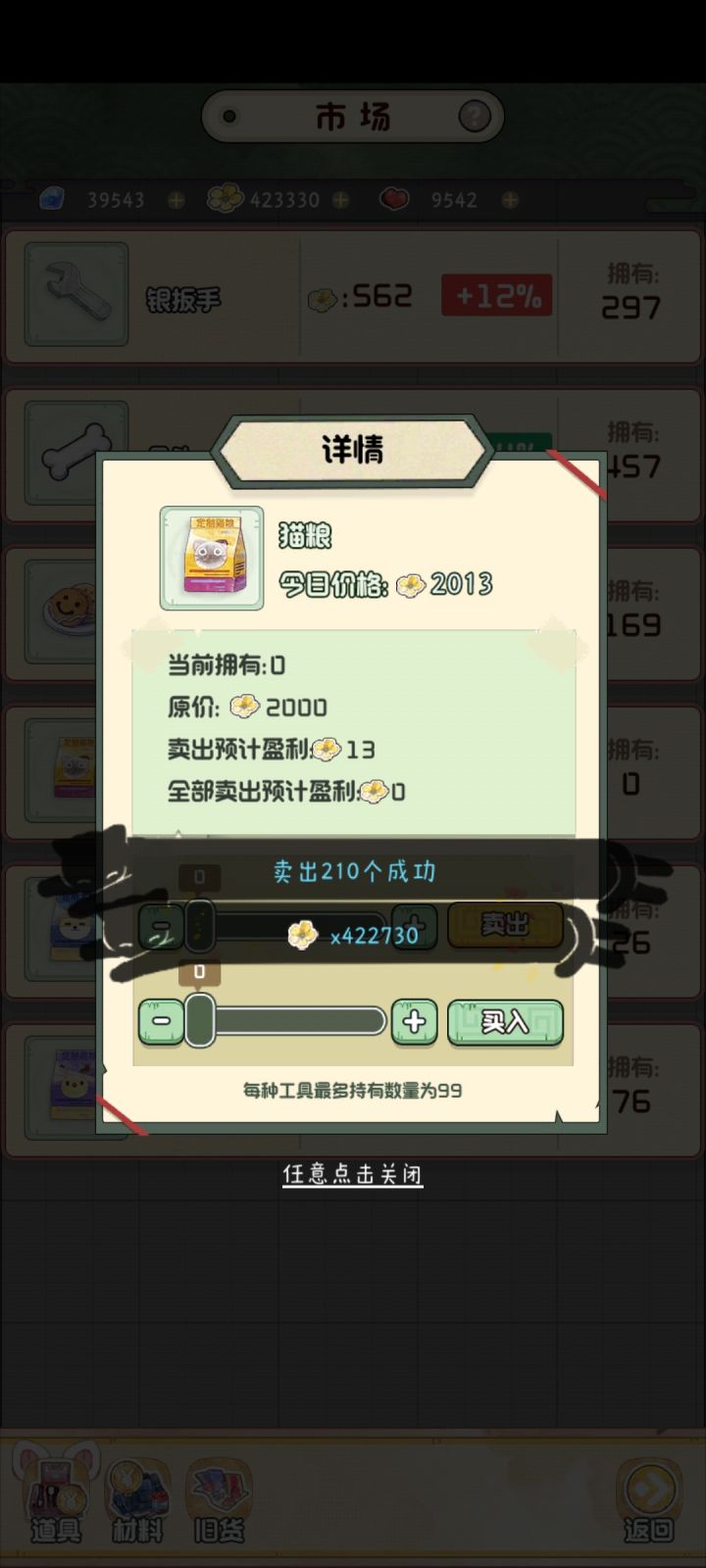 如题通俗易懂,今天的猫粮涨幅为0%,持续买入卖出,最后不花一分钱完成买卖花材料赚取花朵的成就任务,钻石到手