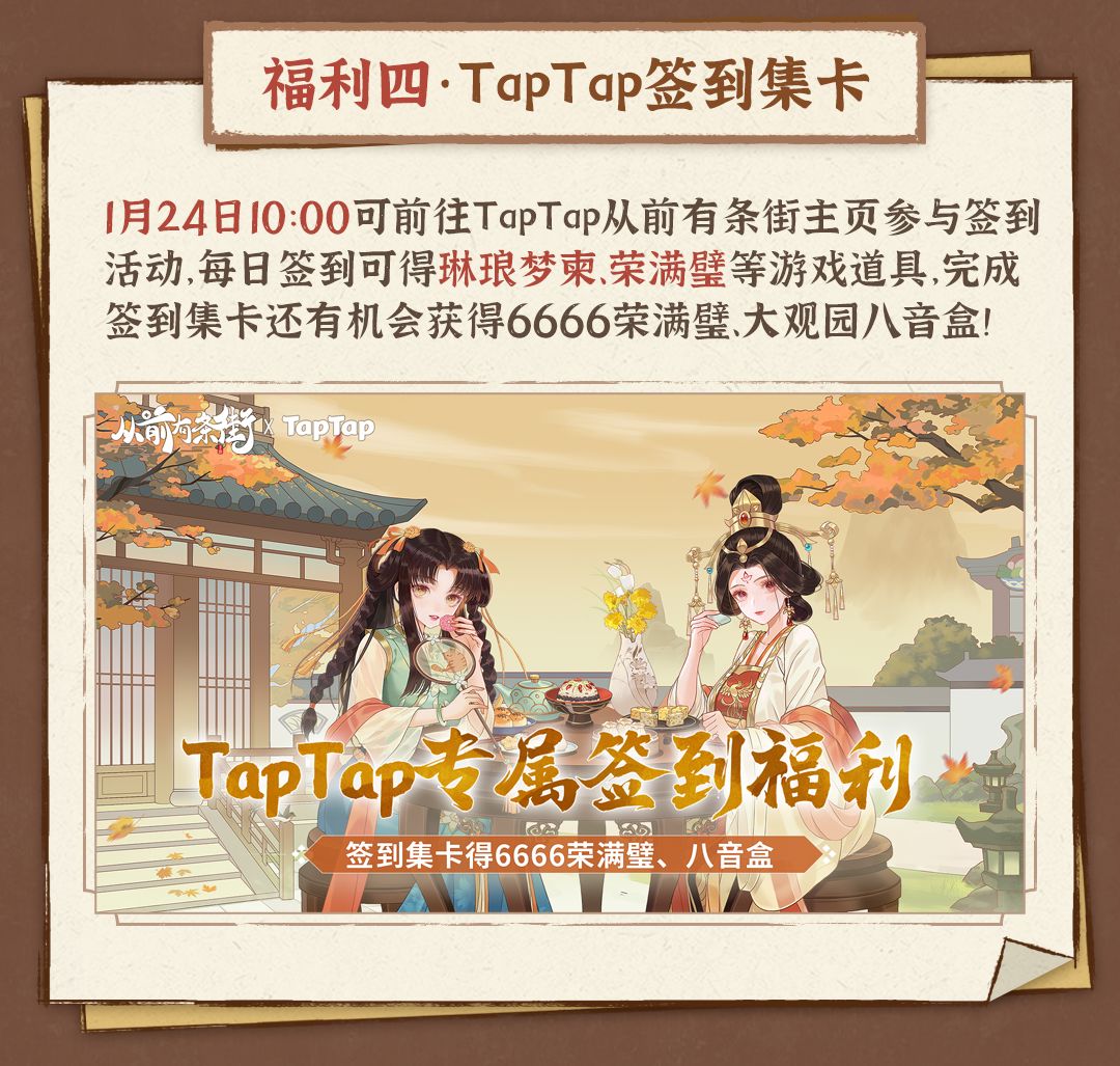 街主前往TapTap-从前有条街主页,完成签到任务即可获得专属奖励,还有机会获得大观园八音盒,6666荣满璧!