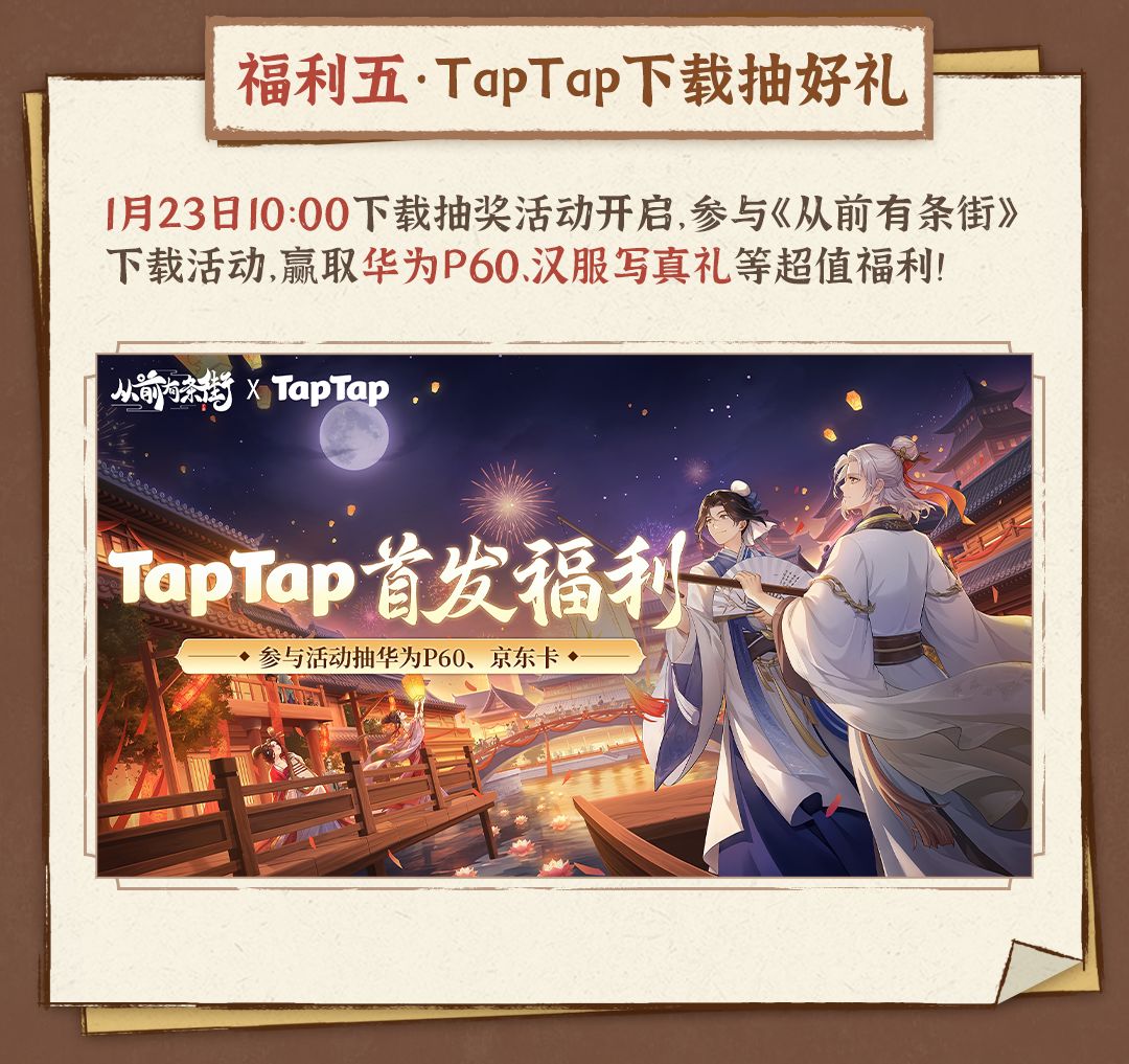 《从前有条街》TapTap独家上线,参与下载抽奖活动赢华为P60、汉服写真集、京东卡等海量惊喜福利!