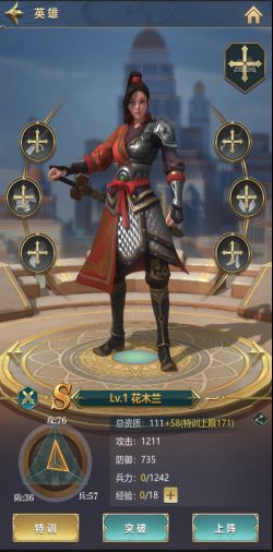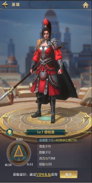 VIP6礼包解锁的穆桂英。她的攻击高,是一名S+的橙色骑兵英雄。玩家可以重点培养她,每天的英雄特训可以增加英雄资质,着重洗她的资质。
