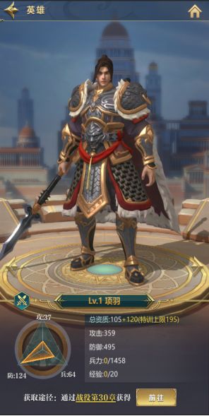 通关战役第30章获得英雄项羽,项羽在橙色英雄里较为强大,本身100+的防御 再配上一套守城装备,很少有英雄可以破其防。