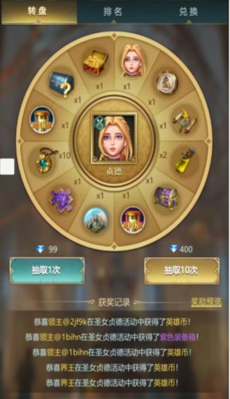 完成主线任务等级达到40级,将开启“贞德”转盘活动。每天免费赠送一次抽奖次数,使用游戏中免费赠送的次数进行单抽,或者转盘抽奖点击十连抽,将有几率抽到英雄贞德或者英雄币。抽到英雄币可以直接去兑换页面用英雄币兑换,这就看每个人的运气了。