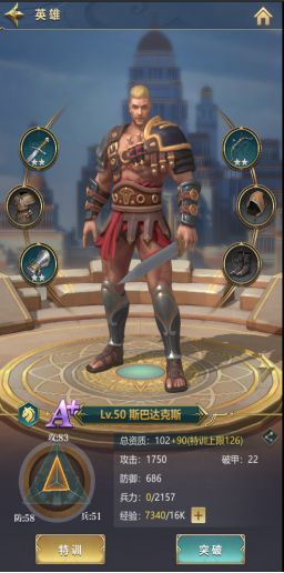斯巴达克斯是一位攻击资质稍高的骑兵英雄,能对步兵英雄进行克制,能帮助领主安全渡过前期的人手缺乏时期,对前期的战役推进有较大的帮助。