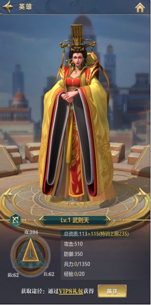 达到VIP8在VIP礼包里购买武则天,她是一位橙色SS弓兵英雄,攻击资质高,前期好用。