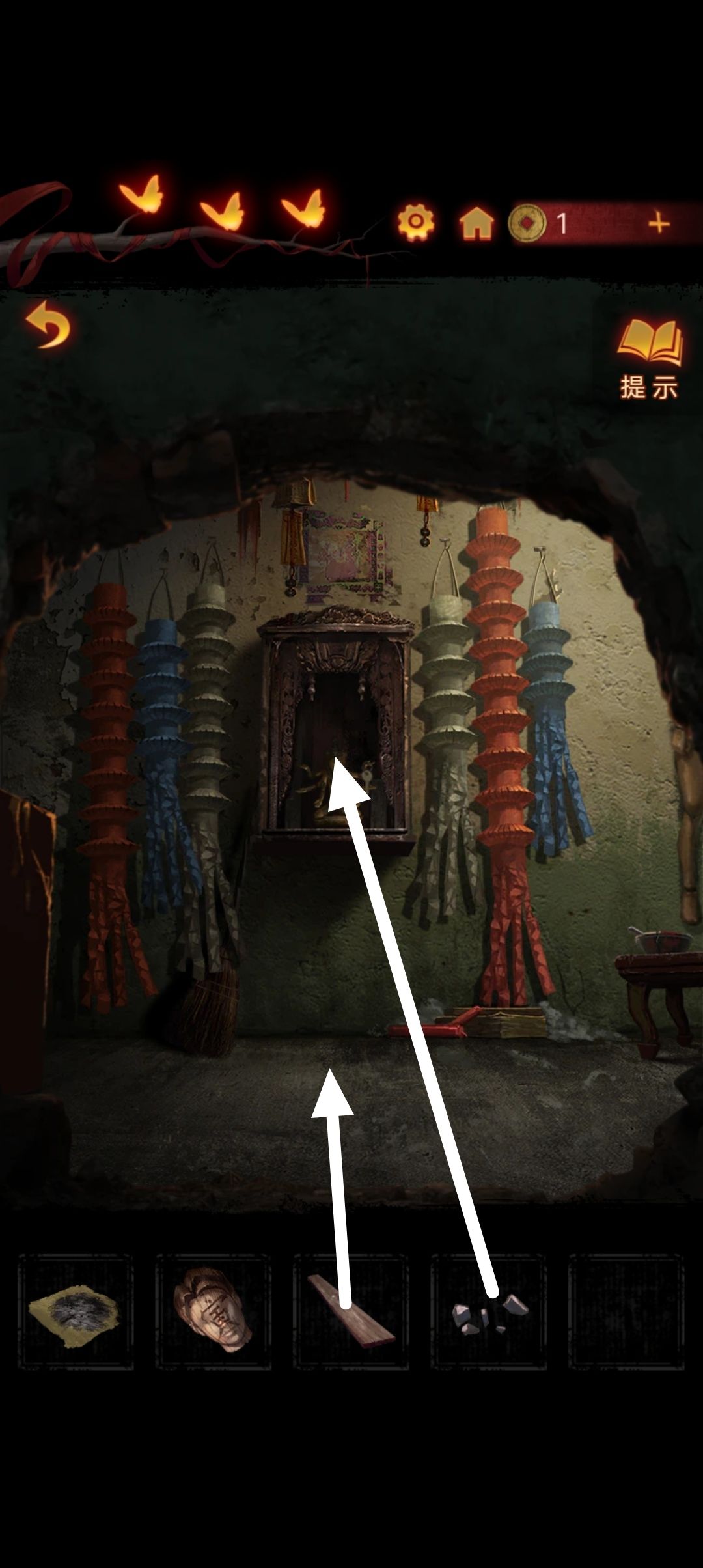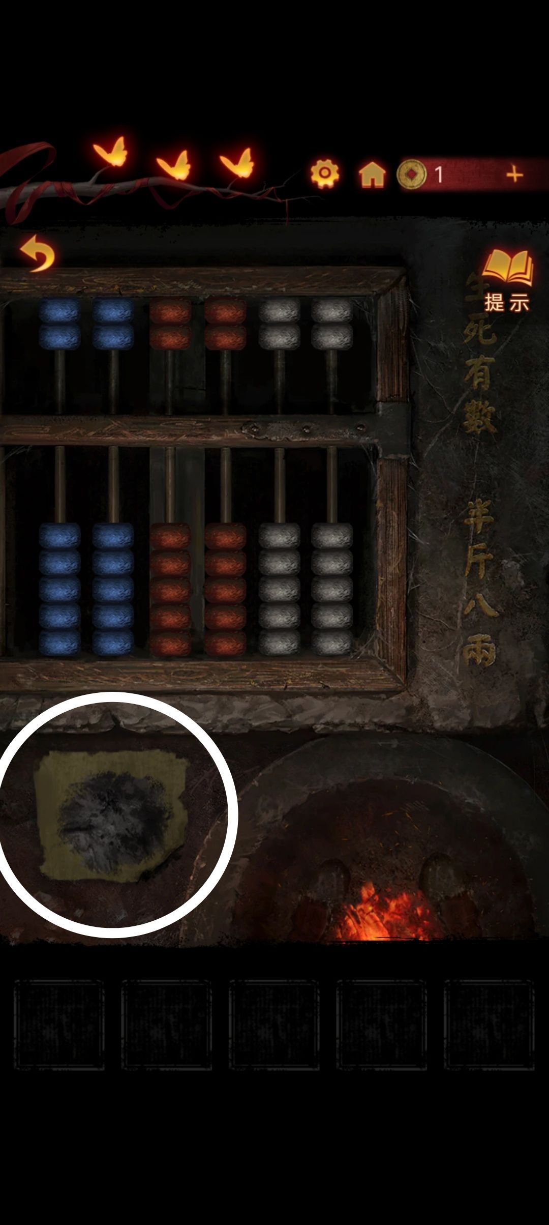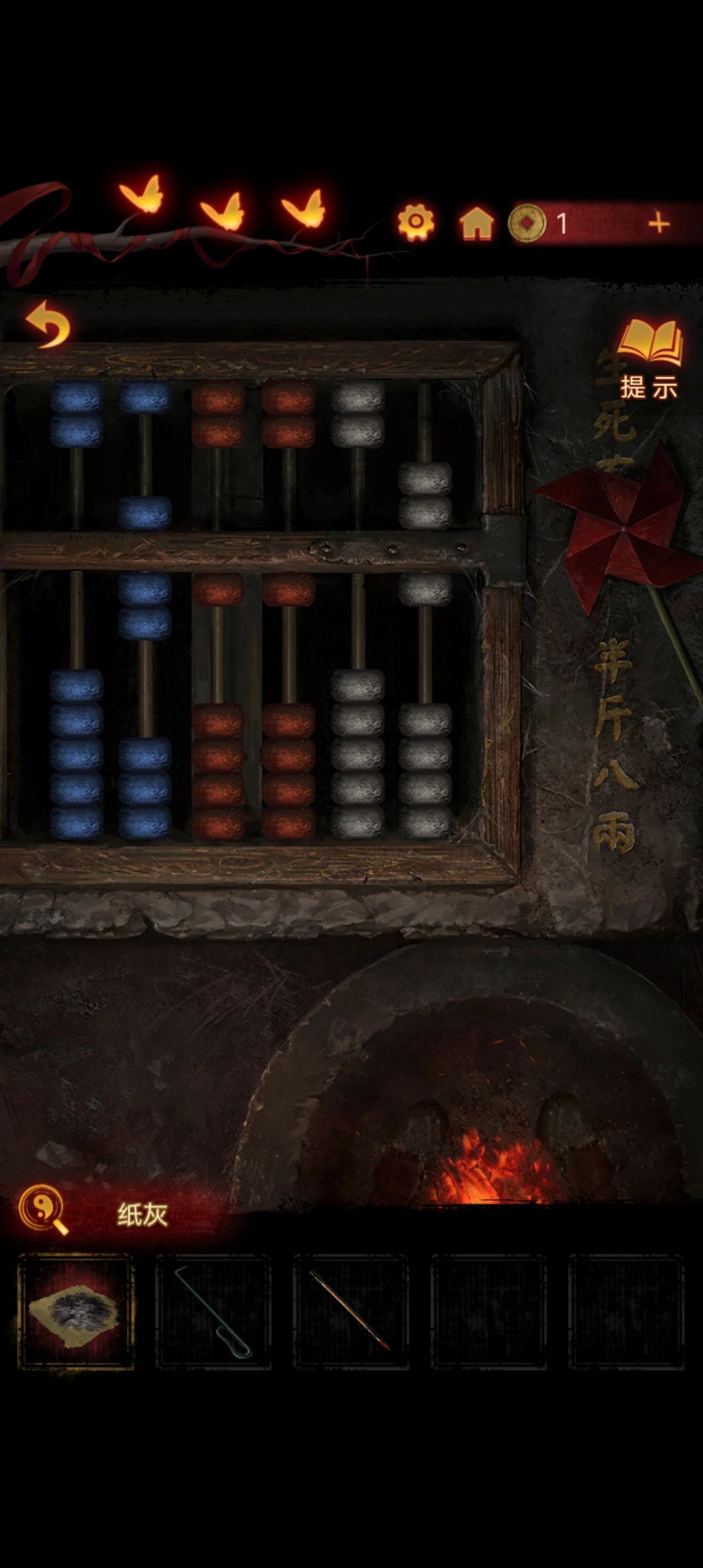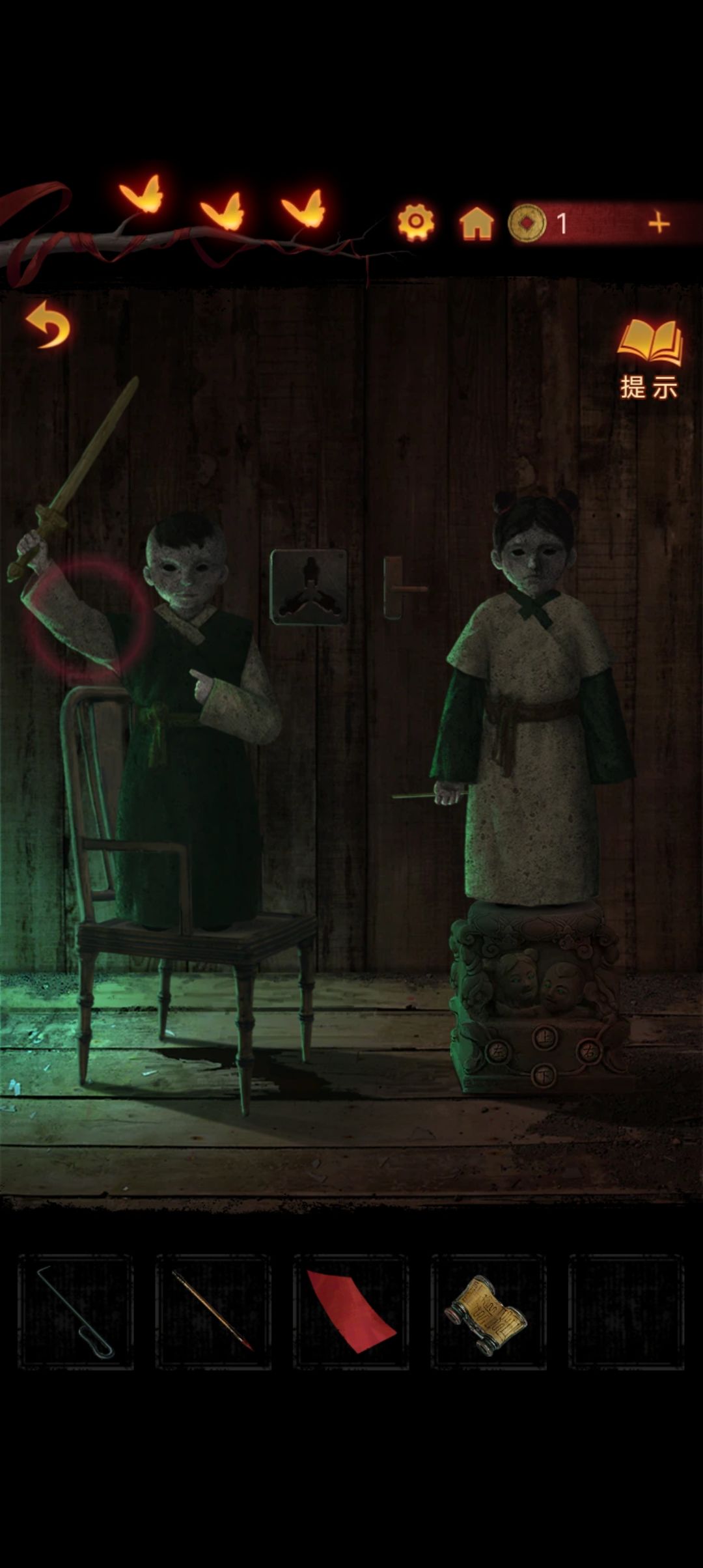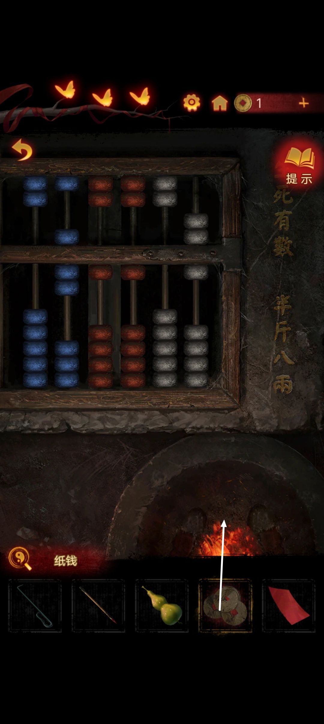 点击阴童子雕像,通过线索一步步调整底座上的『上下左右』,得到一把纸钱