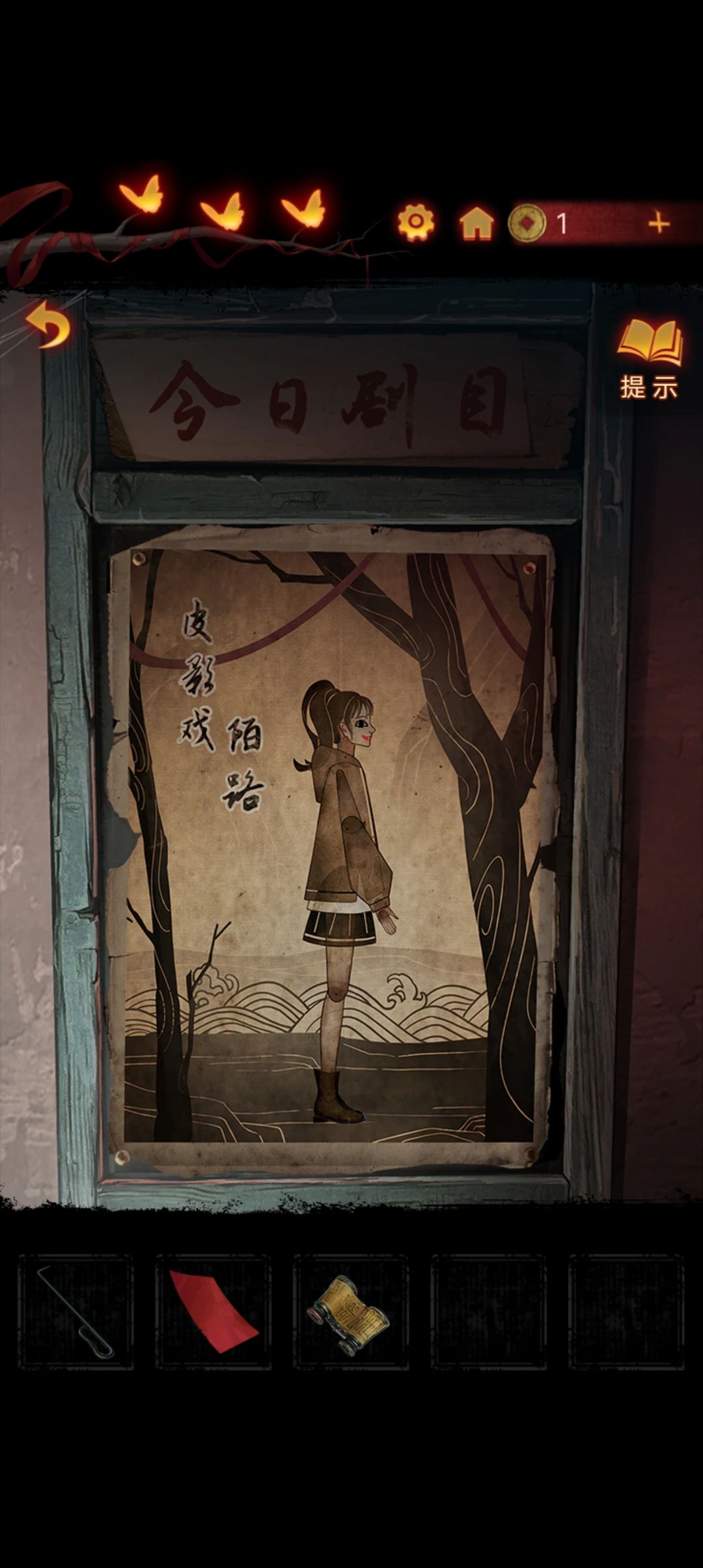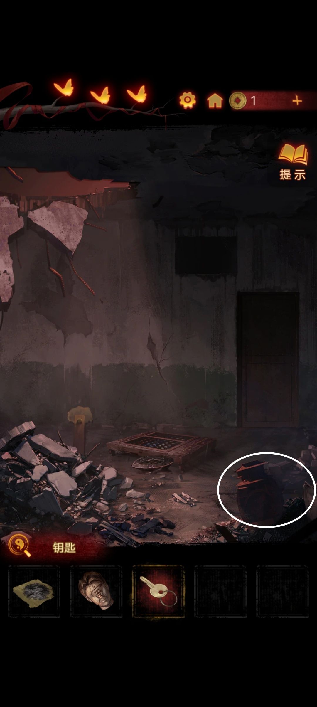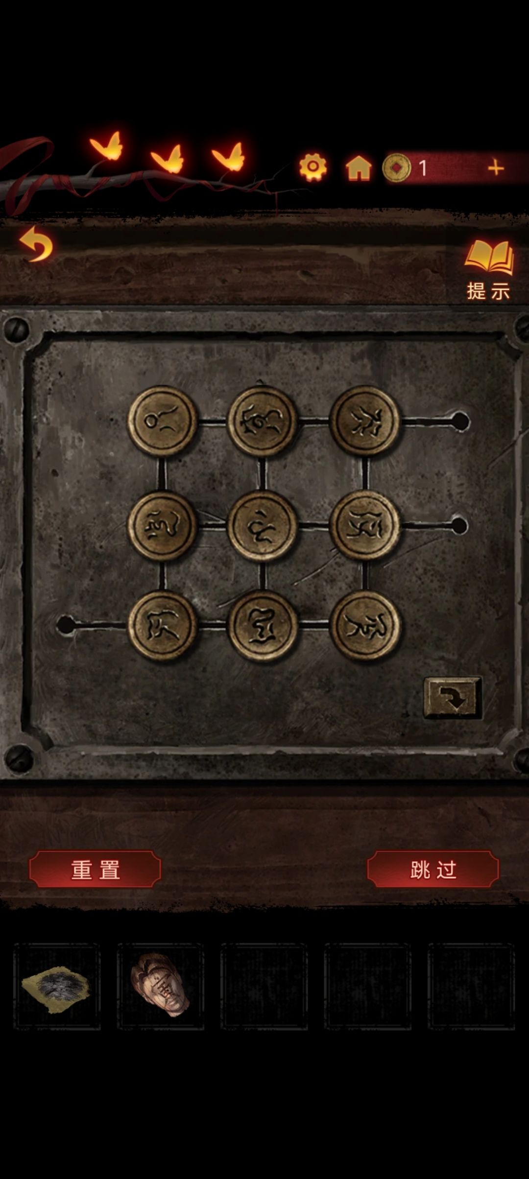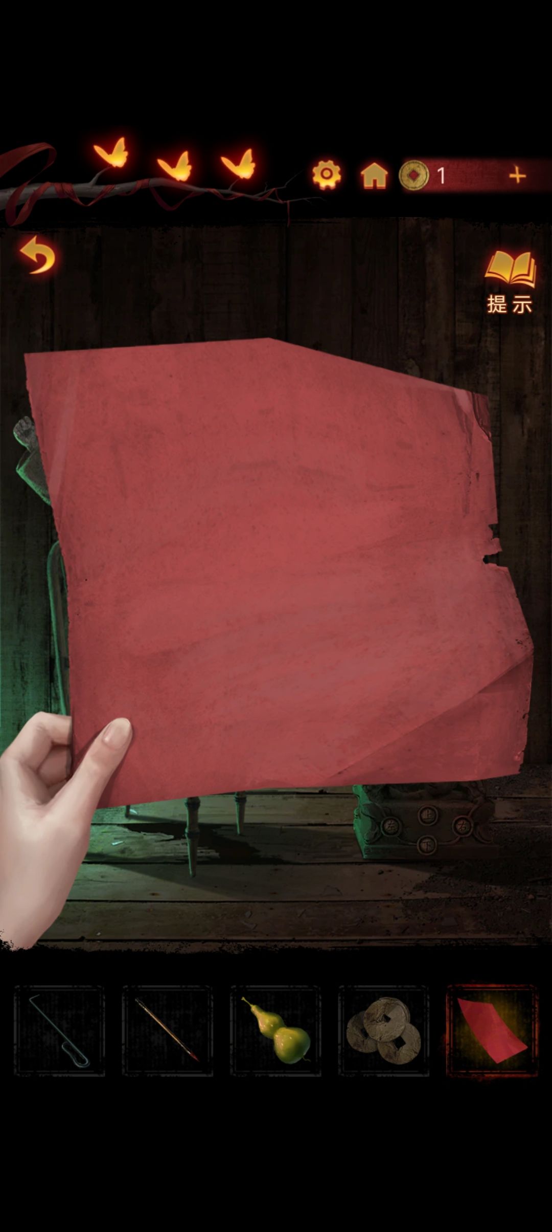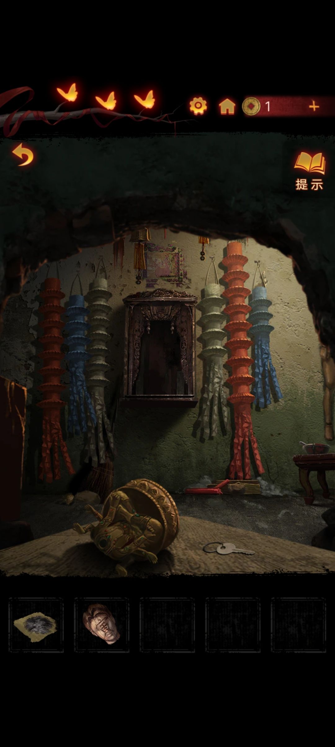 点击阴童子雕像,通过线索一步步调整底座上的『上下左右』,得到一把纸钱