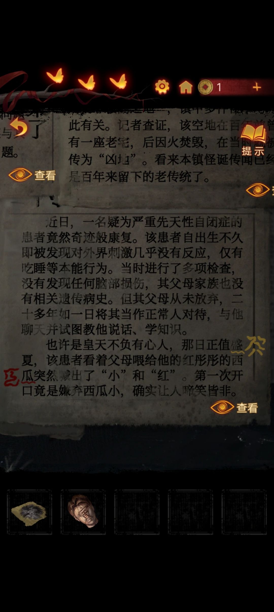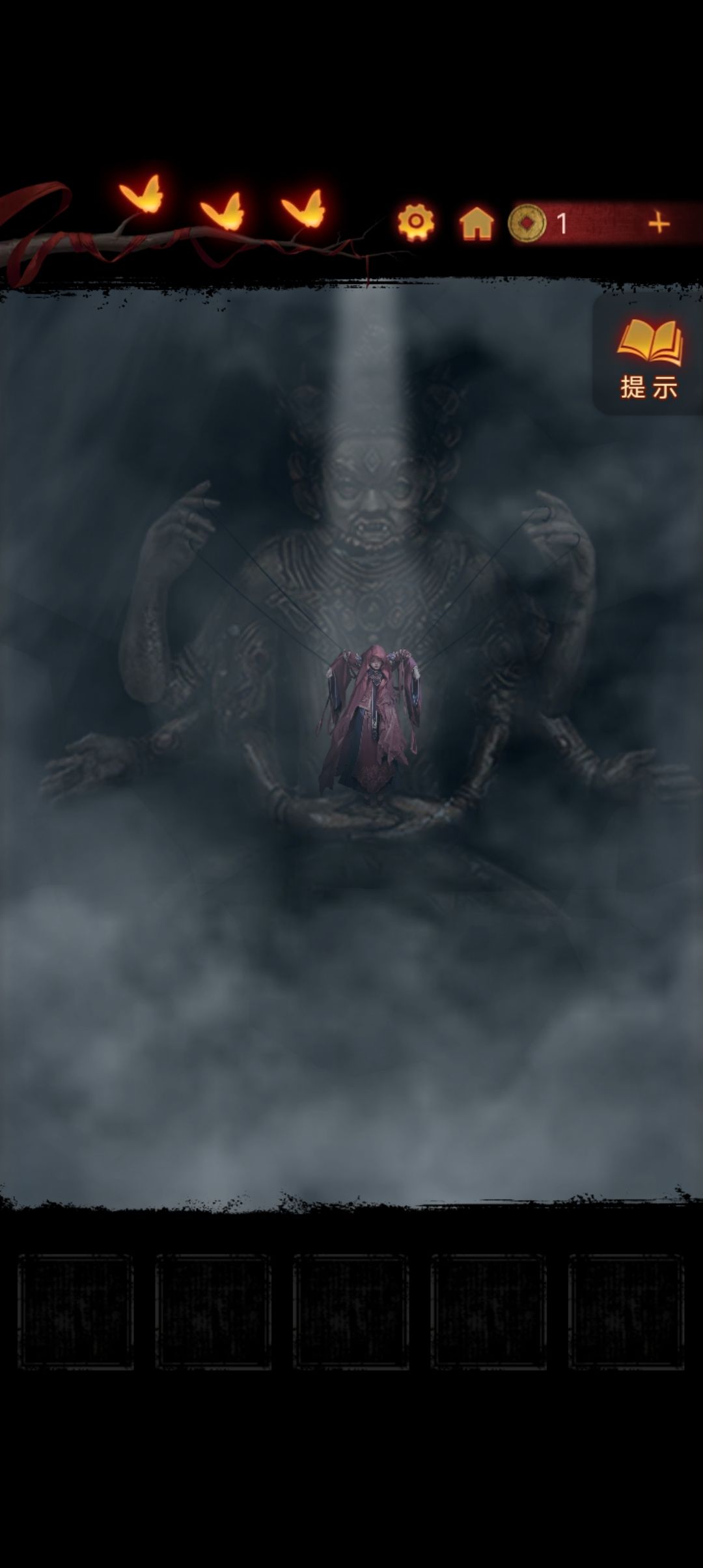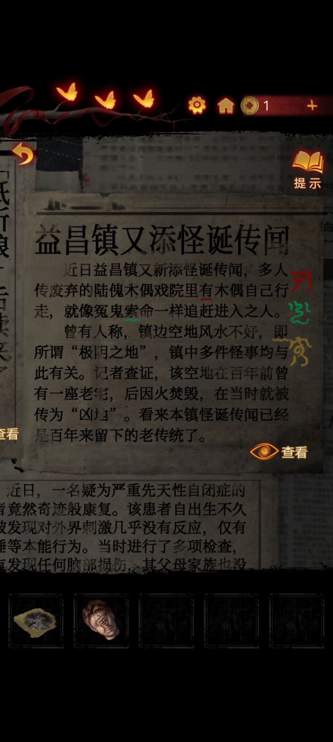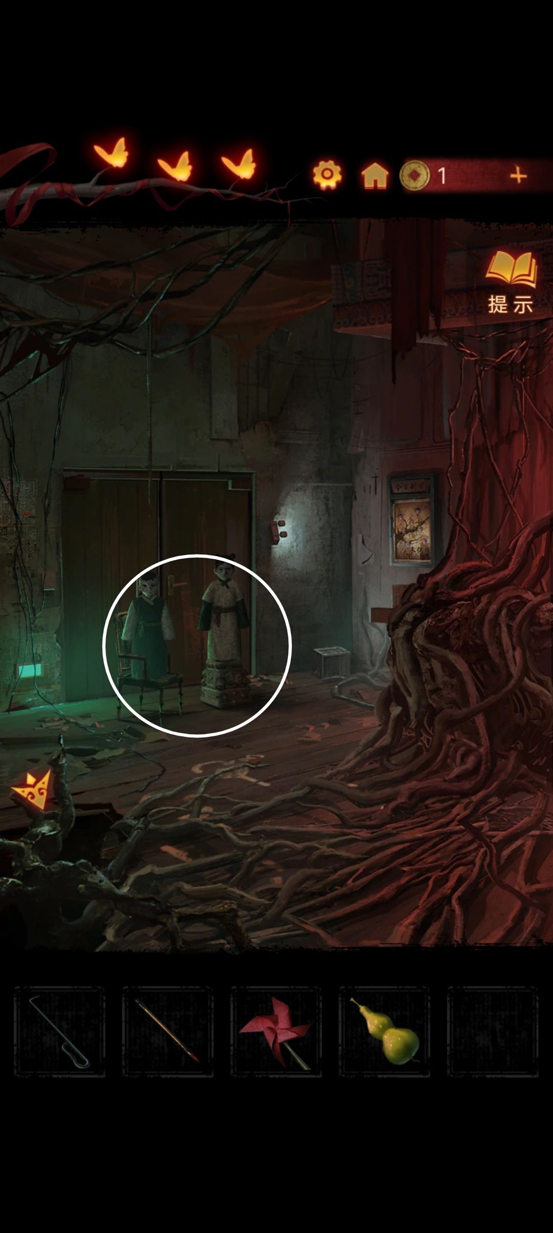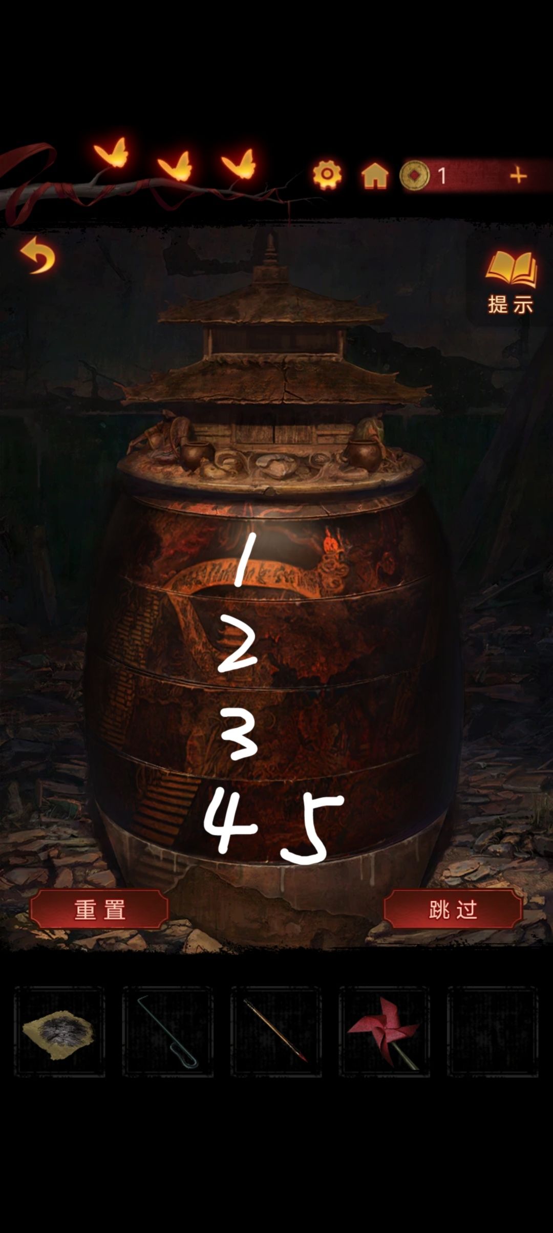 点击阴童子雕像,通过线索一步步调整底座上的『上下左右』,得到一把纸钱