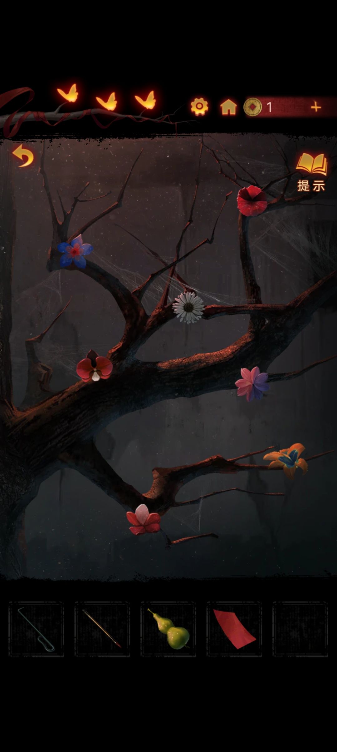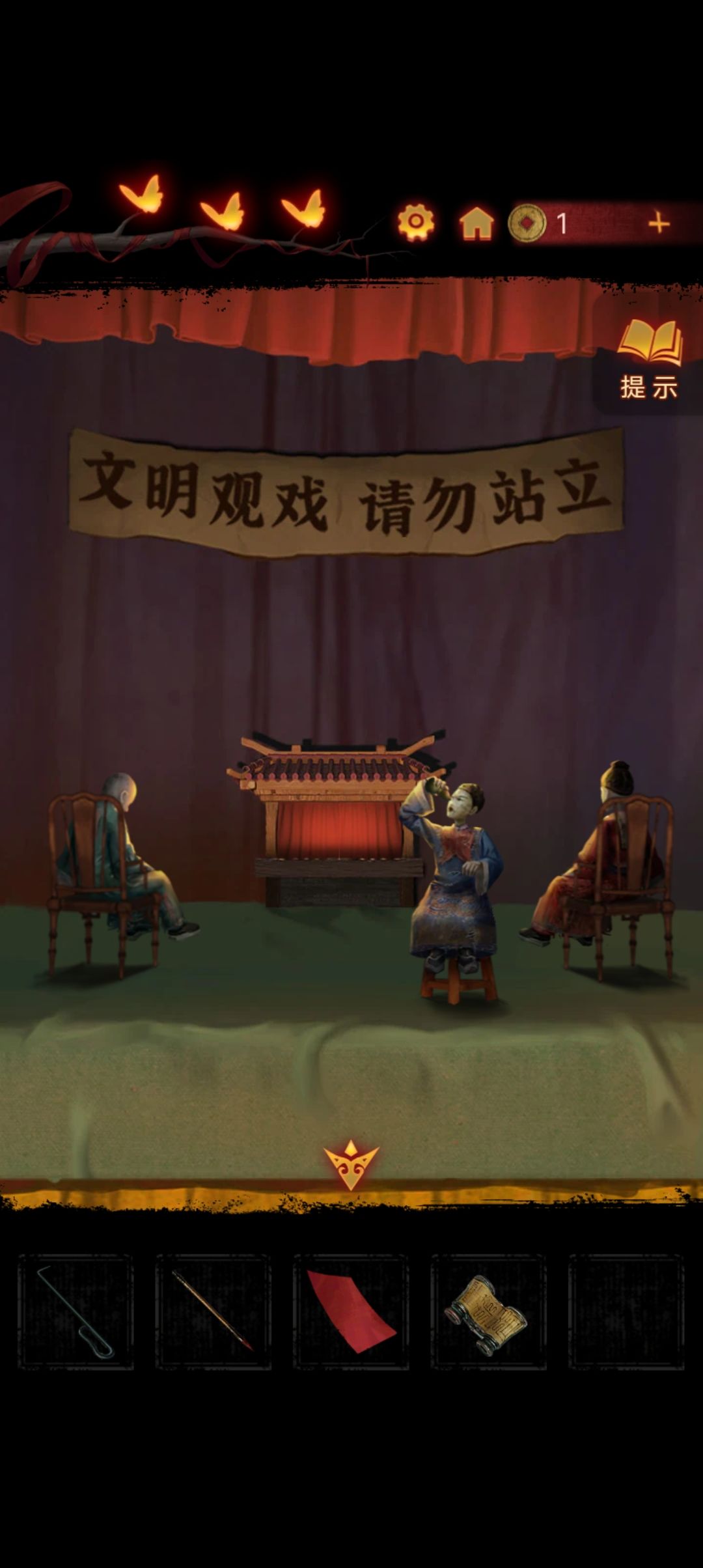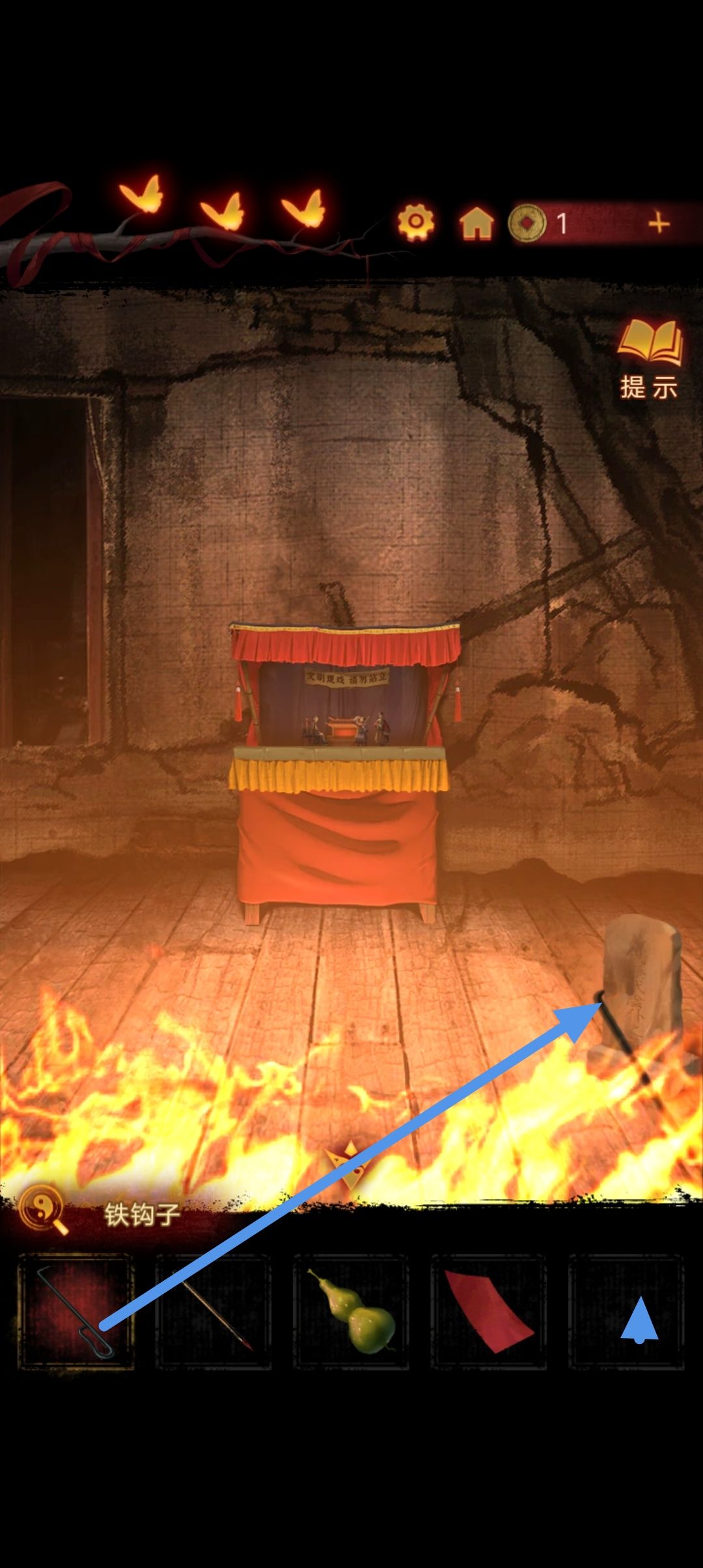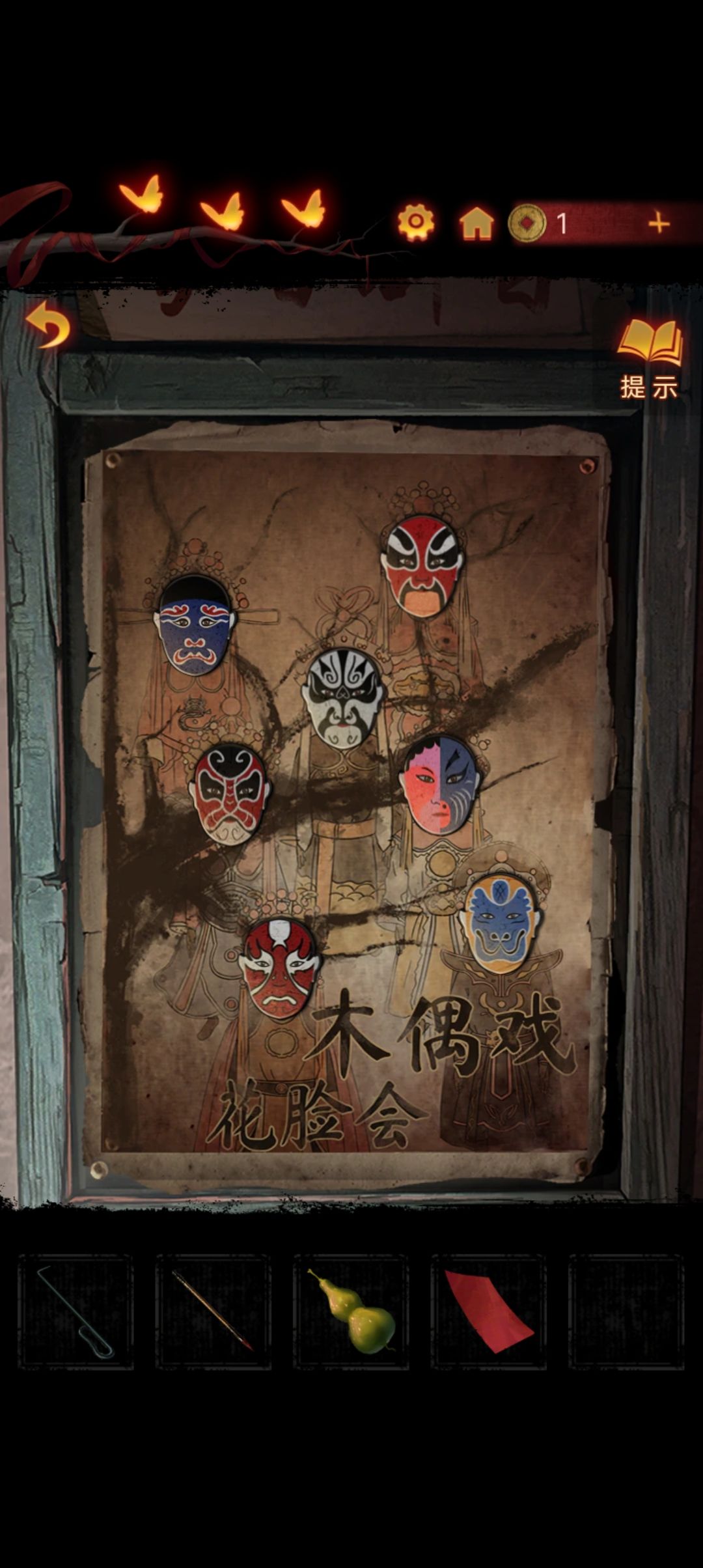 回到楼上,点击墙上的剧目海报,调整脸谱位置至和对应颜色的花的位置相同,戏台起火