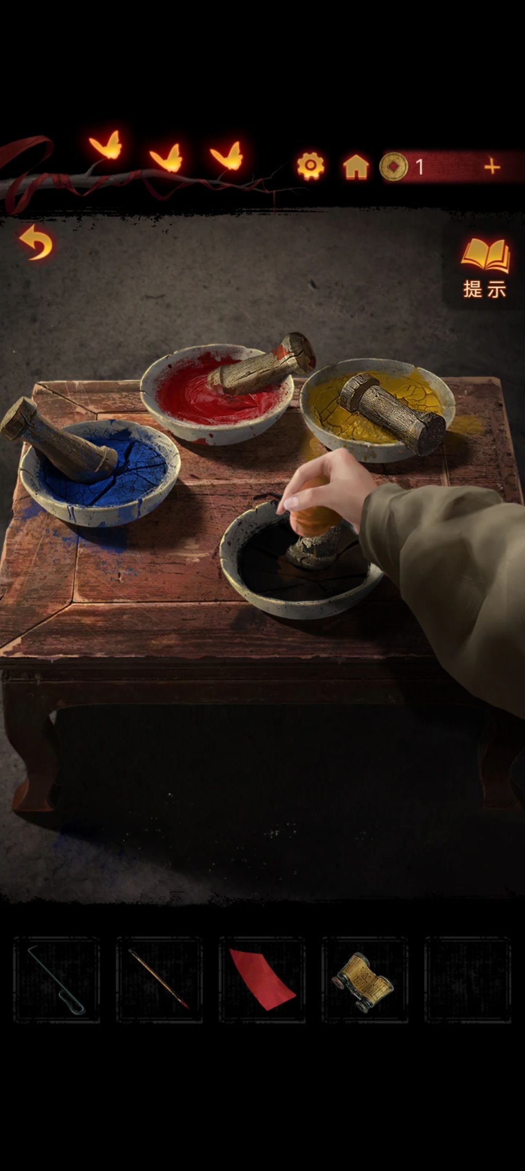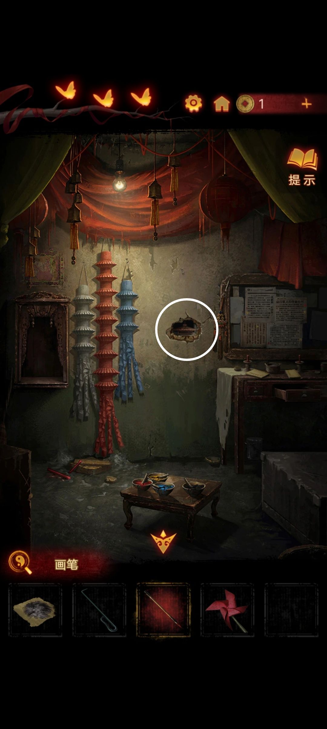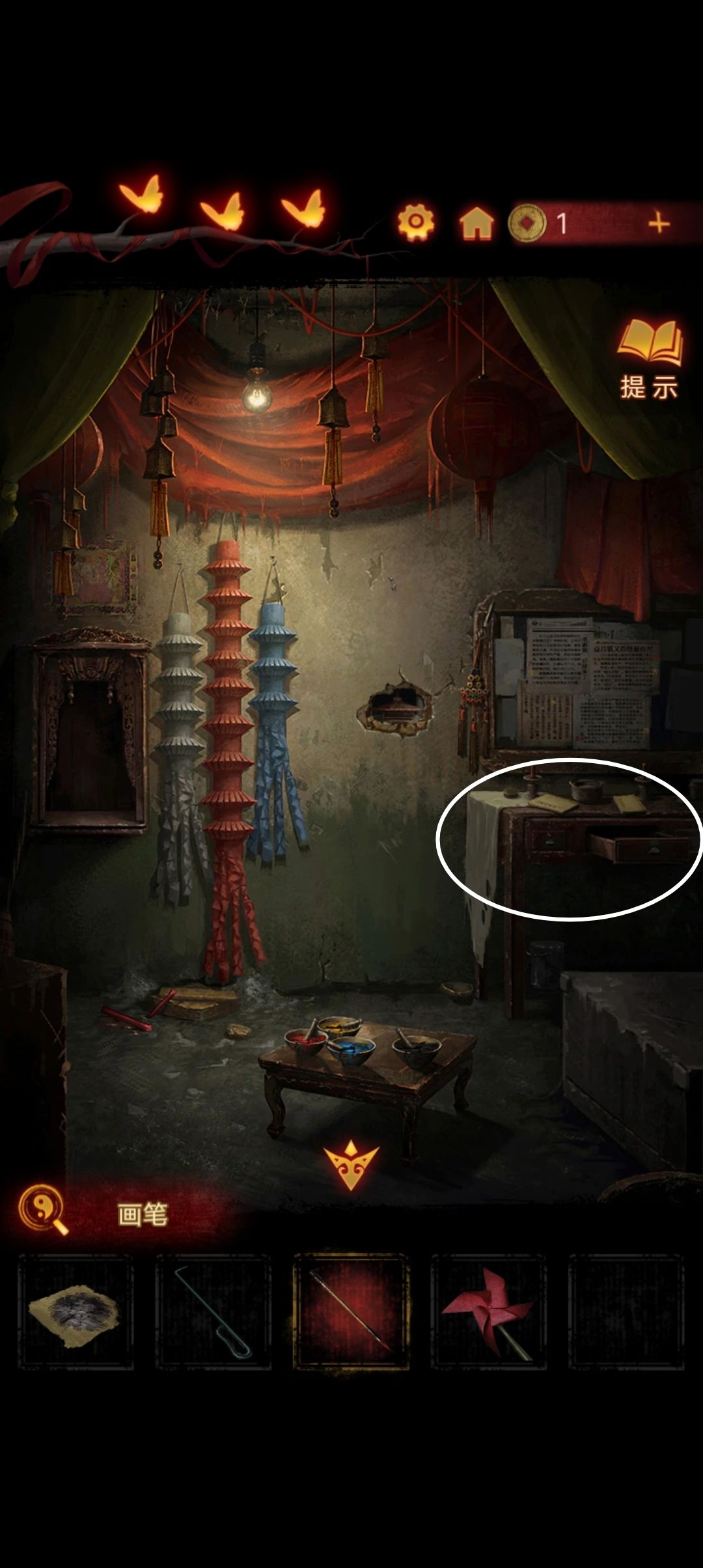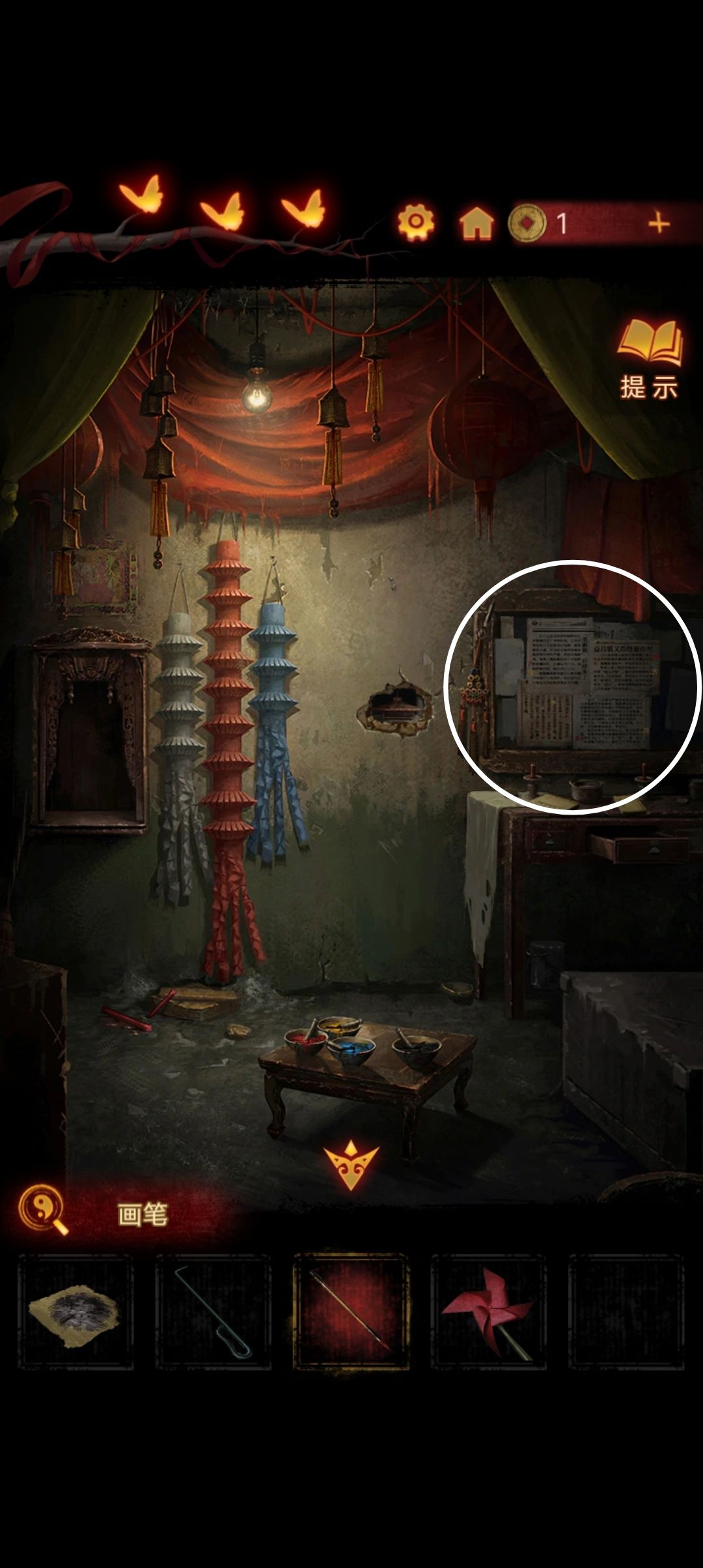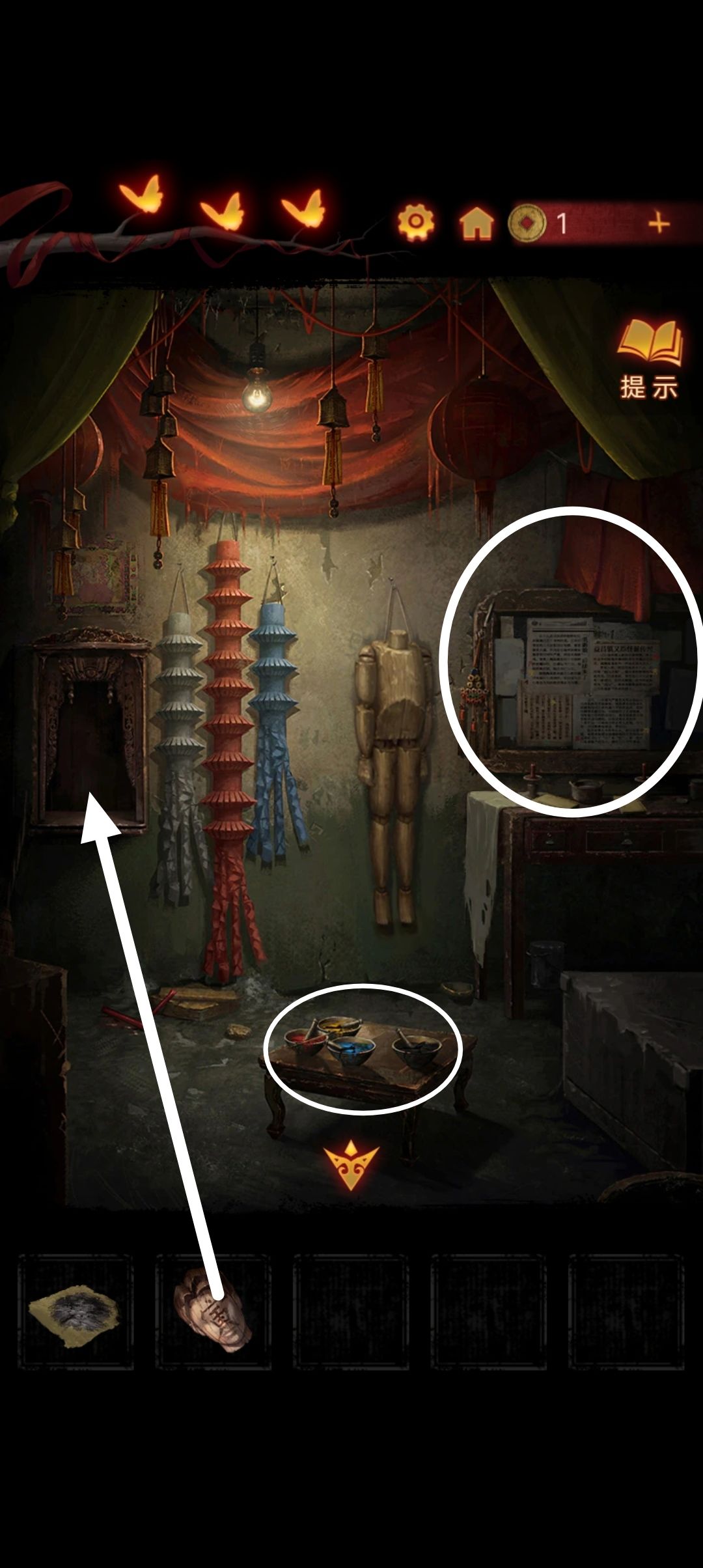 把木偶头放在神龛里,在桌子上拿到画笔,尝试给木偶画眼睛『木偶嫌弃你的画工并收走了一个头颅』
