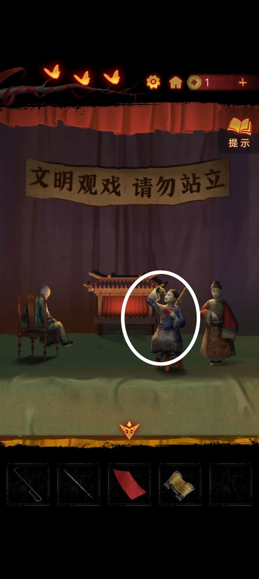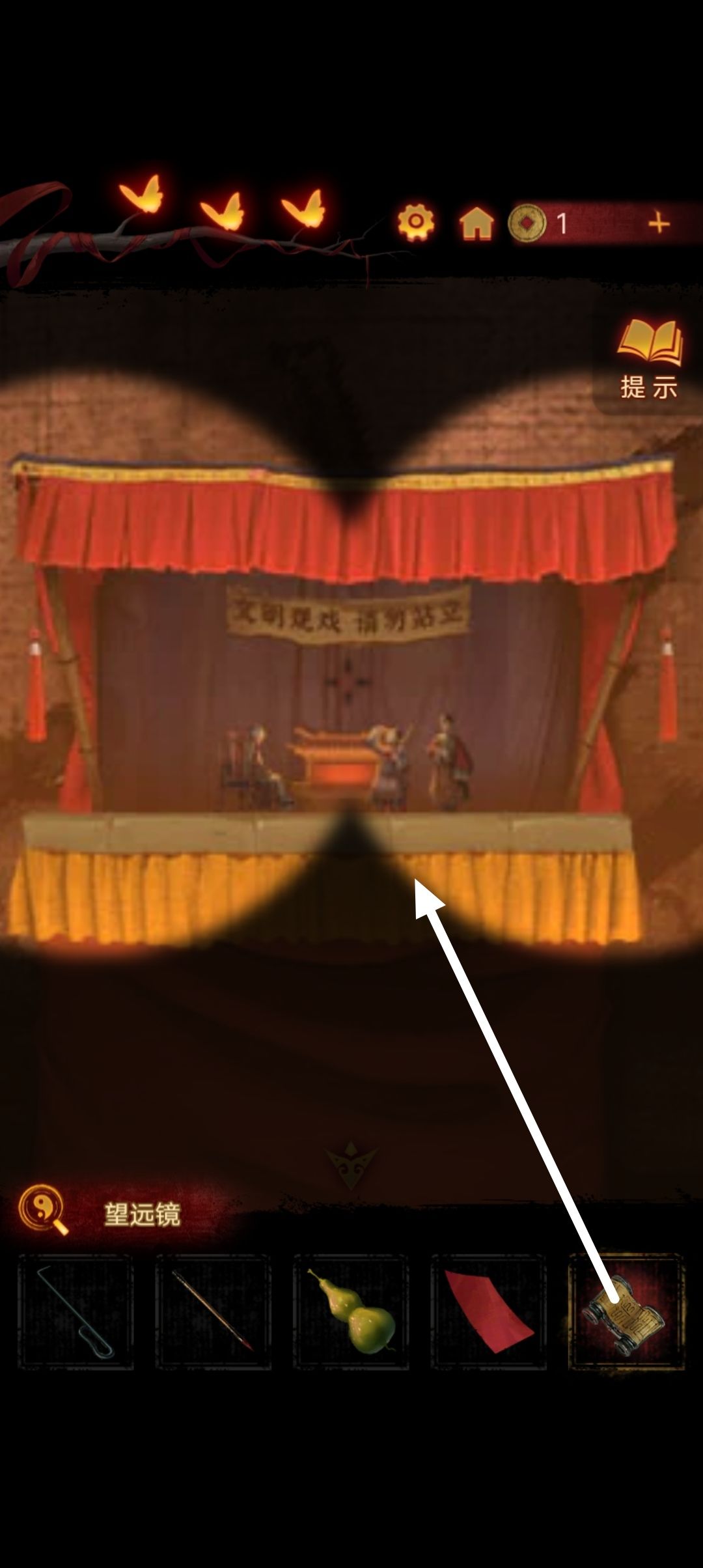 到戏台上把椅子递给右边站着的木偶,然后用望远镜查看戏台,拿到一把酒壶