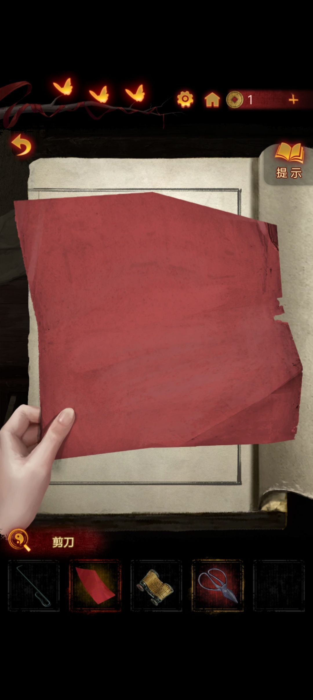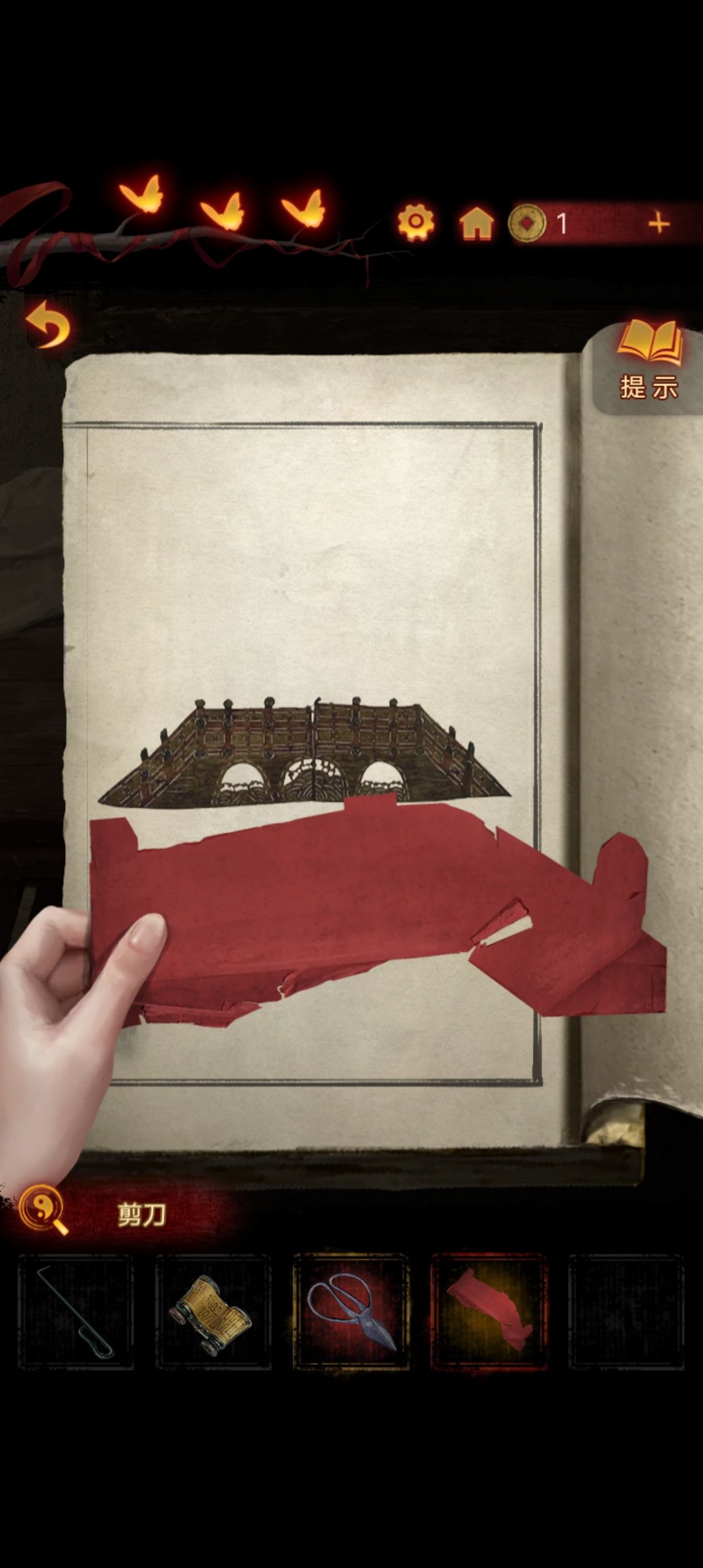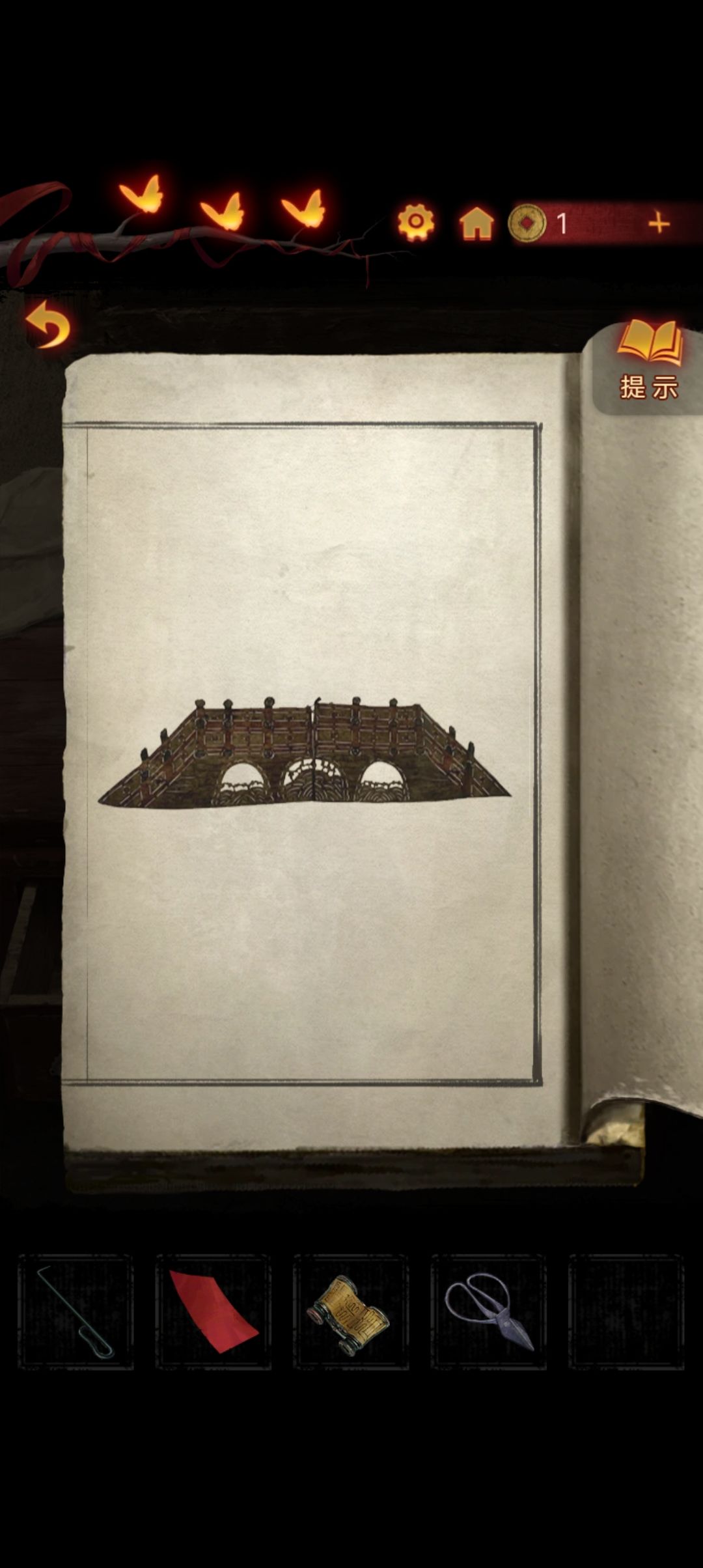 来到右侧房间,把另一本书翻到最后一页,拿出红纸,对比书上的图案剪出一座纸桥『大概是桥吧』