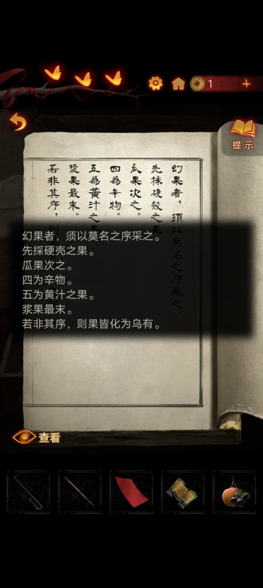 用酒壶给树浇水,按照书里的线索采摘得到瓜果并拿到一把剪刀