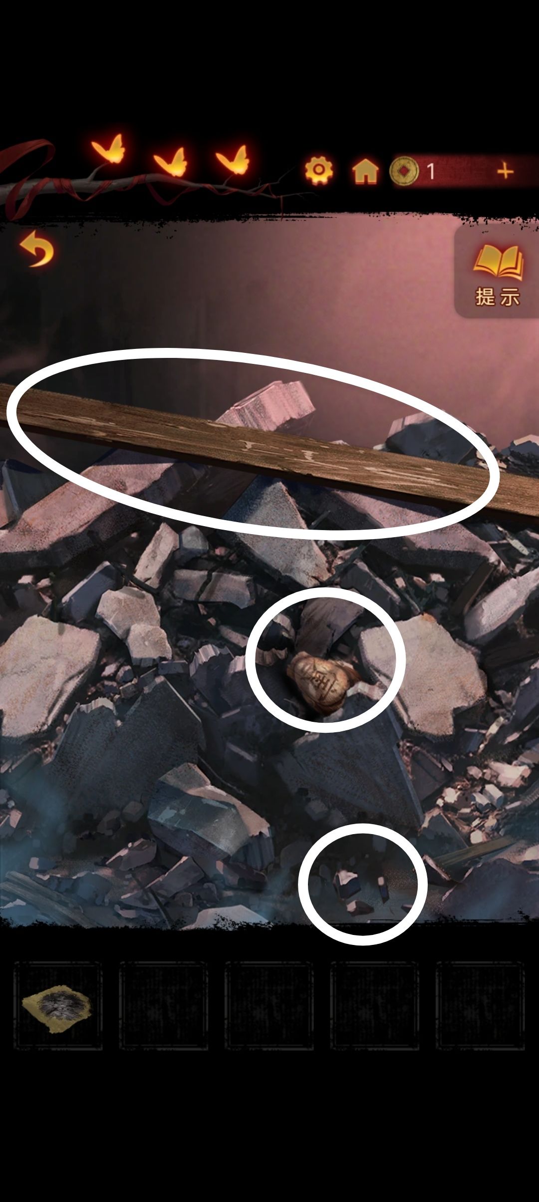 点击左侧石堆,拿到木偶头,木板和碎石块